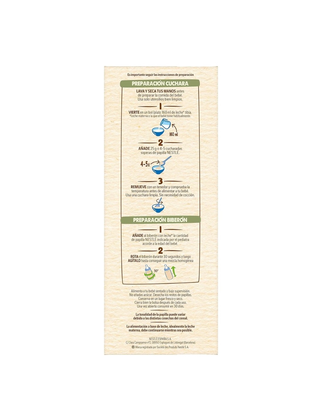 Gracias al exclusivo proceso de Nestlé, que hidrata los cereales para facilitar su digestión, la papilla adquiere una textura cremosa y ligera, adaptada a las necesidades digestivas del bebé. Además, está enriquecida con hierro, calcio, zinc y vitaminas A y C, esenciales para el crecimiento, el desarrollo cognitivo y la función inmunitaria. Una papilla completa, segura y deliciosa, diseñada para ofrecer una alimentación equilibrada, sin aceite de palma ni azúcares añadidos.