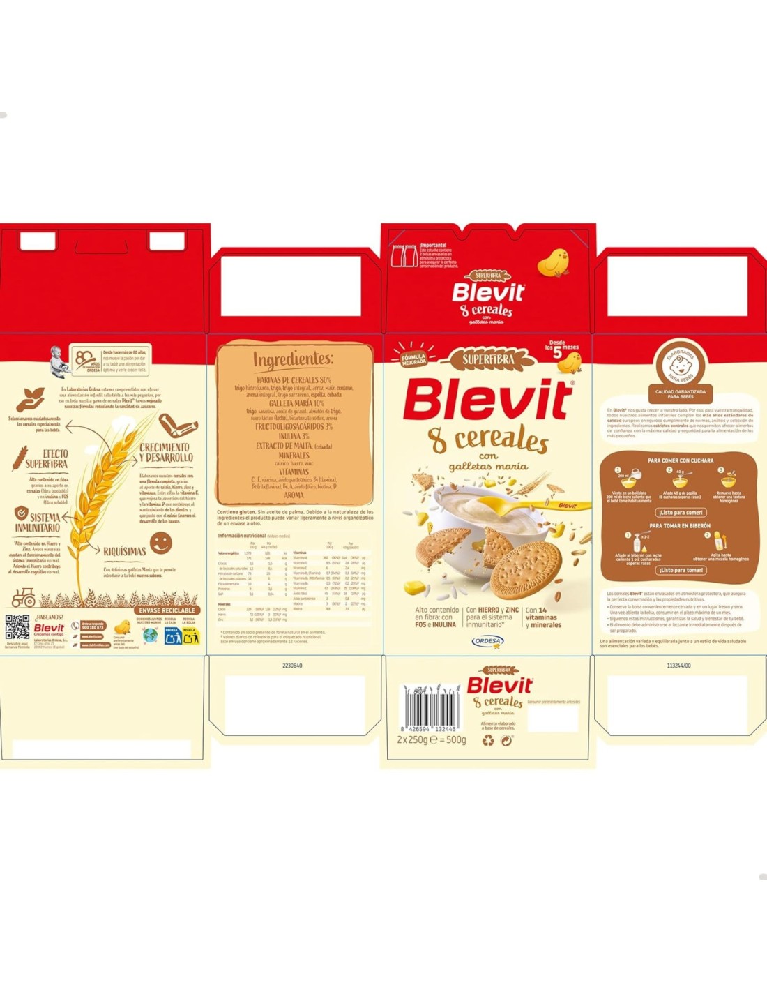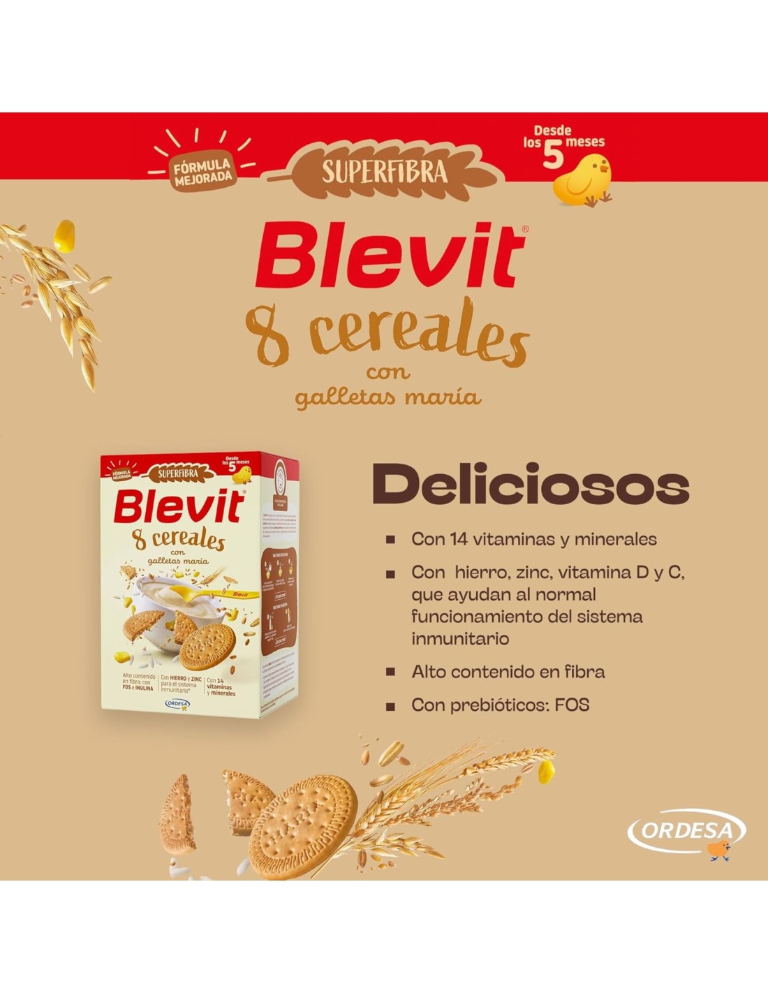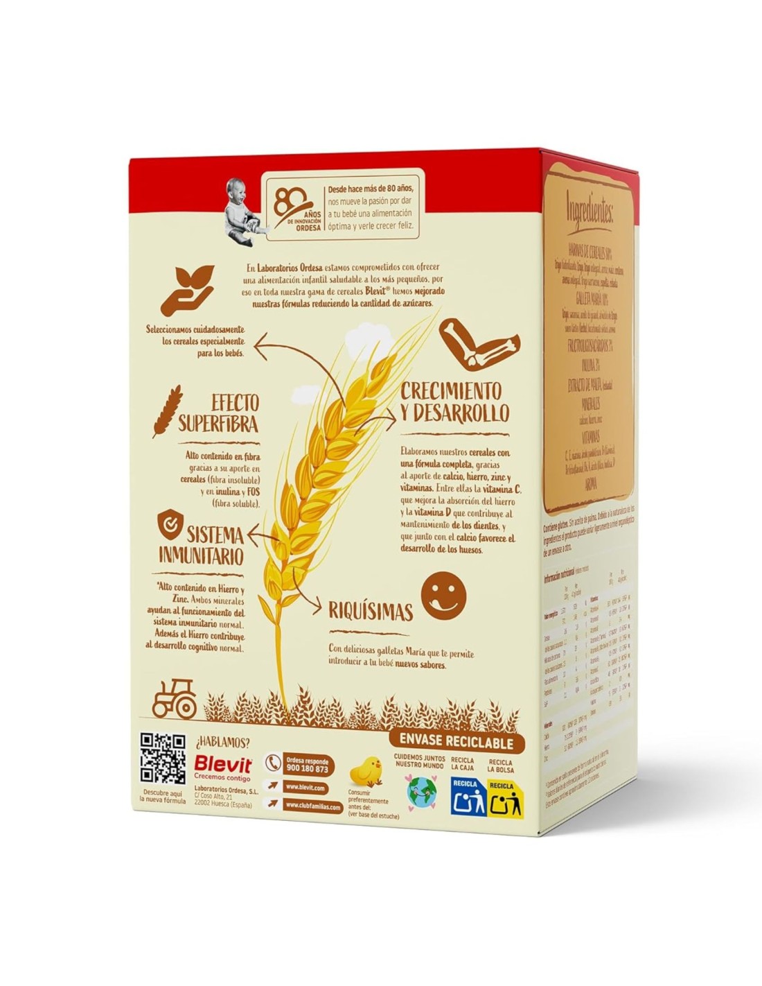 Blevit Superfibra 8 Cereales con Galletas María combina una mezcla equilibrada de cereales (trigo, arroz, avena, cebada, centeno, maíz, mijo y sorgo) con auténticas galletas María, logrando un sabor suave que encanta a los bebés.
