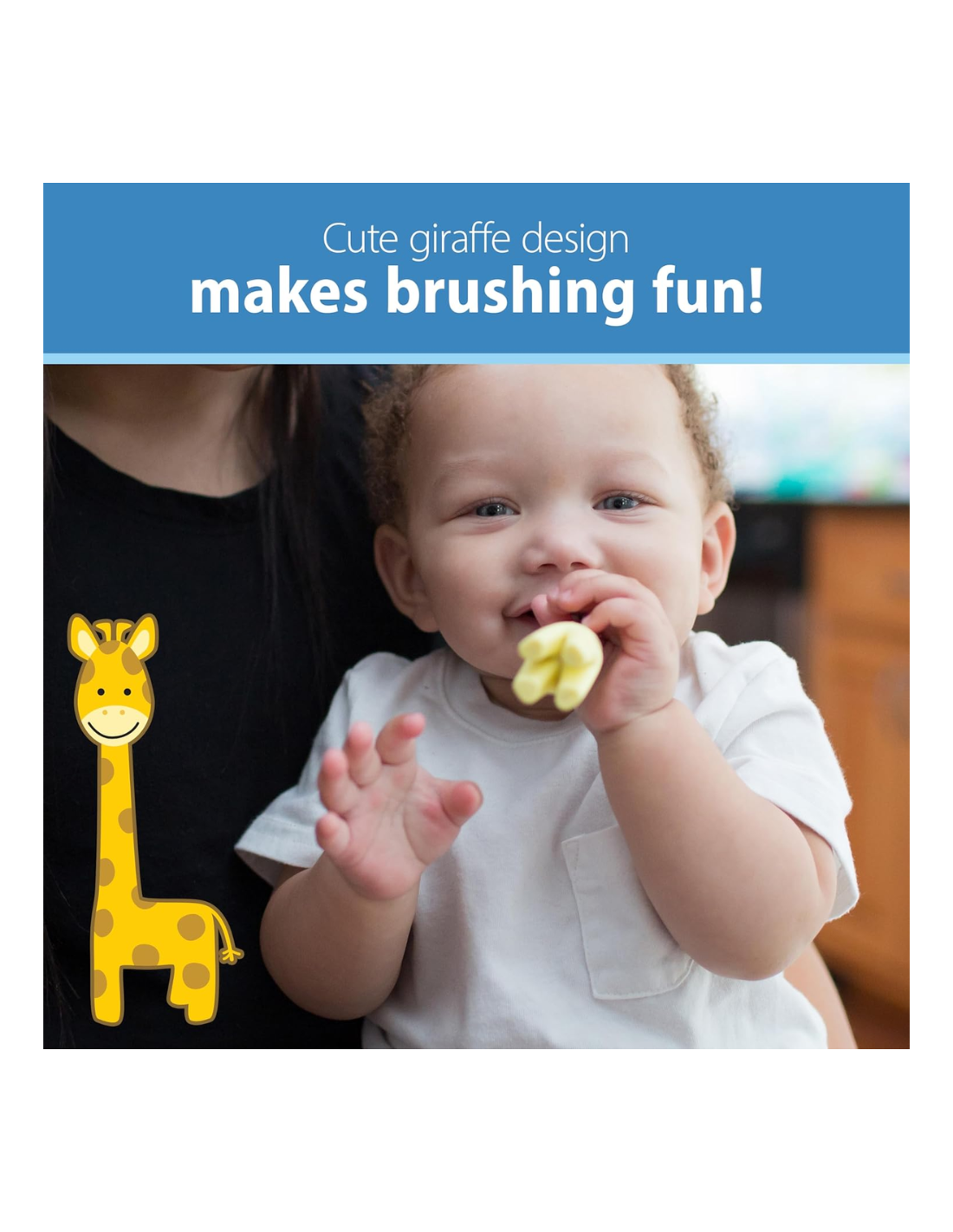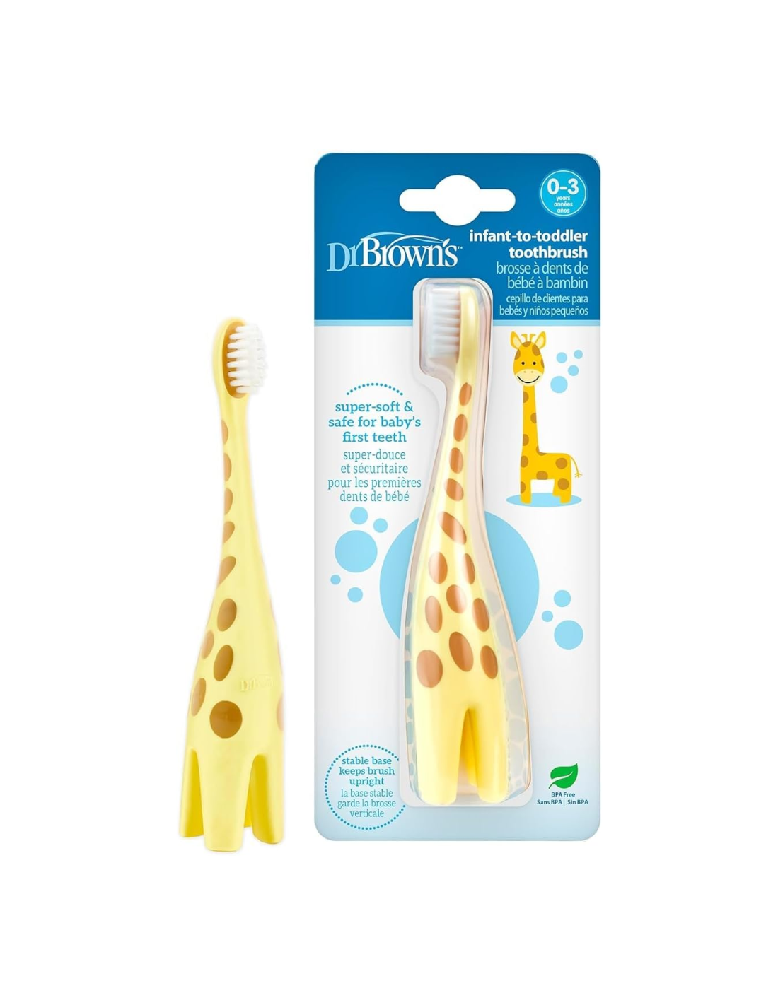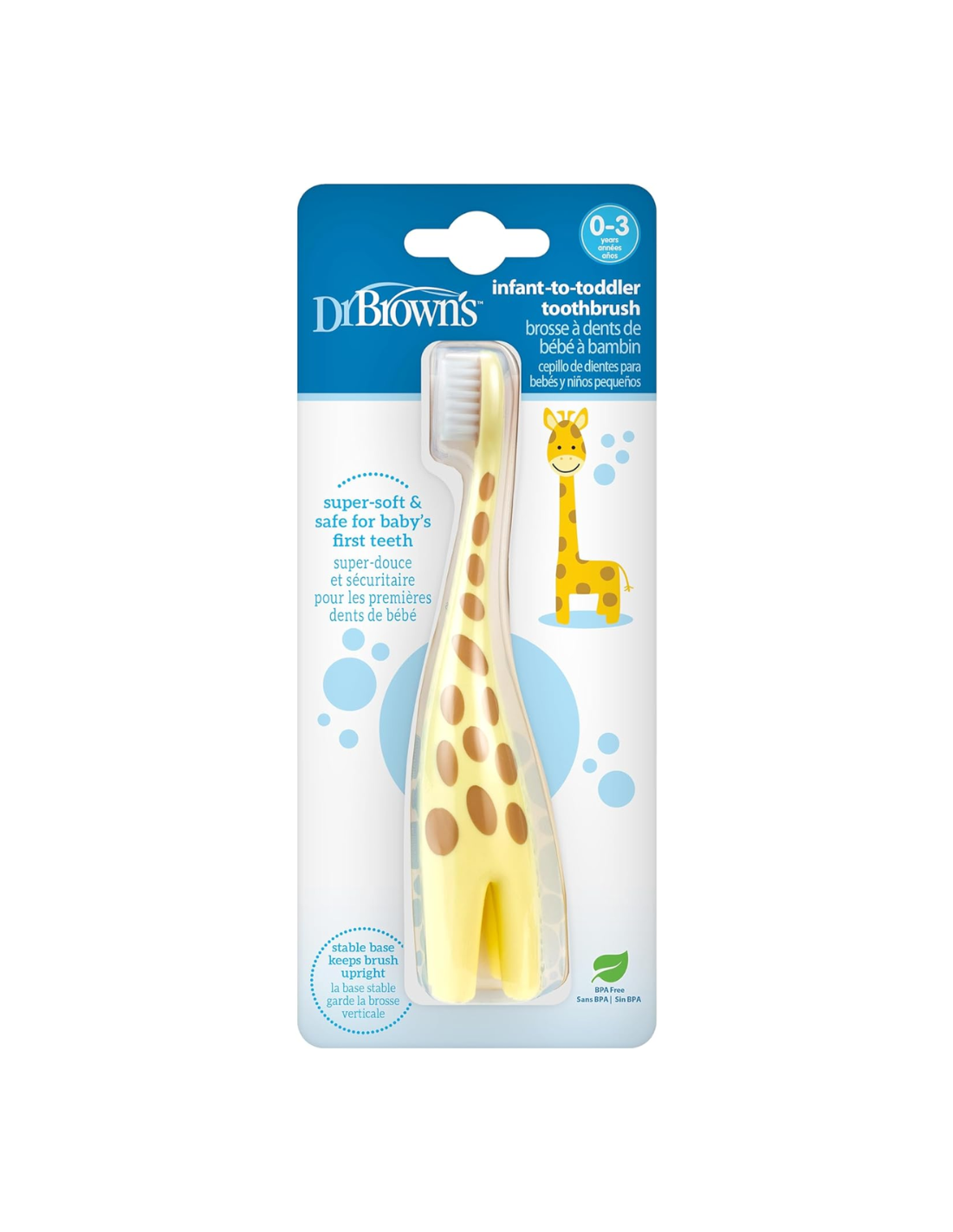 El Cepillo de Dientes Jirafa 12M+ Dr. Brown’s es el compañero ideal para iniciar al bebé en la higiene bucal de forma segura y divertida. Su original diseño en forma de jirafa, combinado con su mango ergonómico y sus cerdas de silicona extrasuaves, lo convierten en un cepillo perfecto para las primeras rutinas de cepillado.