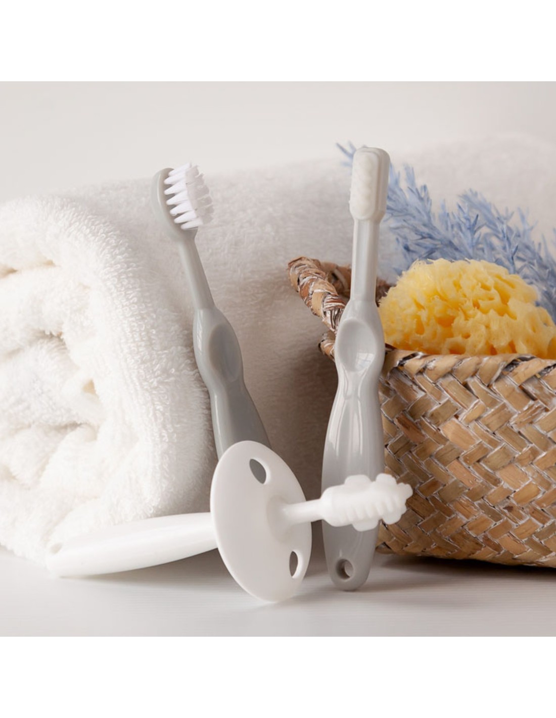 El Set Cepillos Dentales Evolutivos Gris de Kiokids es ideal para instaurar hábitos de higiene bucal desde los primeros meses de vida. Diseñado para adaptarse a cada etapa del desarrollo dental del bebé, este pack incluye tres cepillos con diferentes tipos de cerdas y funcionalidades.