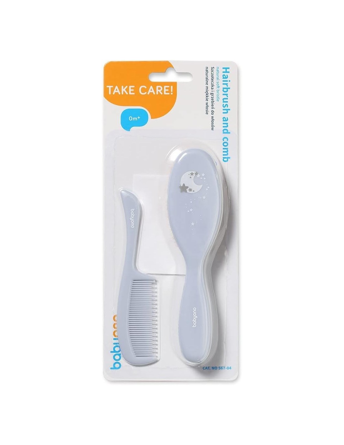 El Set de cepillo y peine BabyOno con cerdas naturales está diseñado para cuidar el delicado cabello del bebé desde recién nacido. Las cerdas extra suaves de origen natural masajean el cuero cabelludo sin irritarlo, favoreciendo la circulación y ayudando a relajar al bebé durante el cuidado diario. El peine incluido tiene puntas redondeadas que permiten peinar con suavidad sin arañar la piel. Ambos accesorios son ligeros, ergonómicos y fáciles de manejar para los padres.