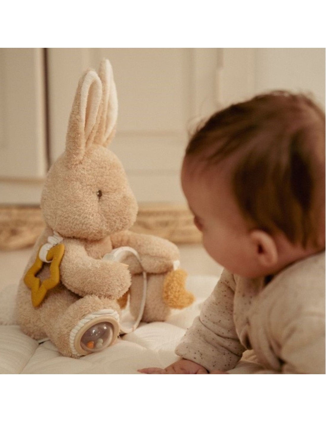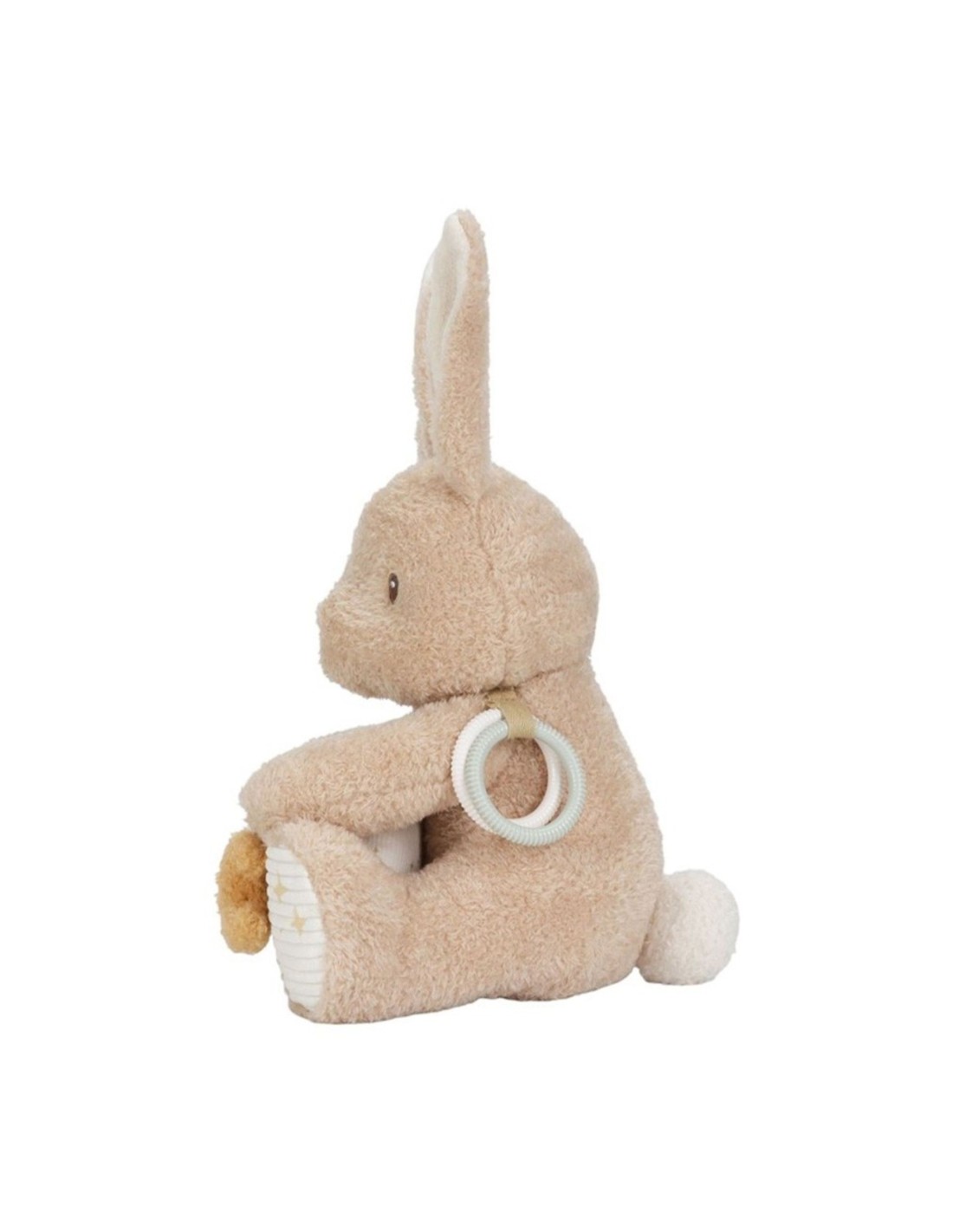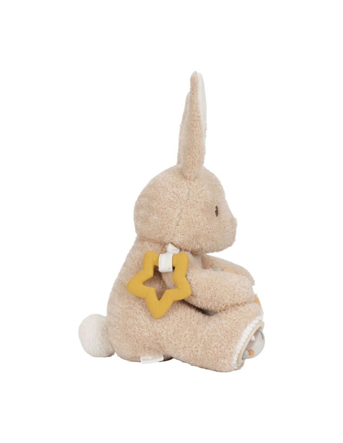l conejo de actividades de la colección Newborn Naturals de Little Dutch está diseñado para acompañar al bebé en sus primeras etapas de desarrollo. Con múltiples texturas, sonidos y detalles interactivos como espejito, etiquetas y sonajero, favorece la estimulación temprana y el descubrimiento del entorno. Su diseño en tonos neutros y suaves lo convierte en un juguete versátil, ideal tanto para el juego como para la decoración de la habitación del bebé.