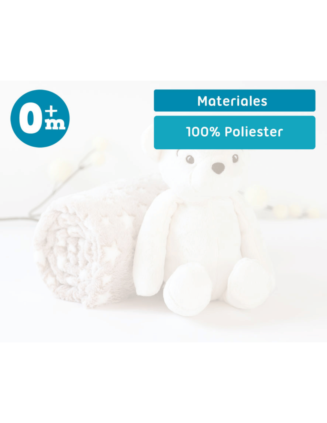 El Oso de Peluche Blanco con Mantita de Estrellas Kiokids es un dúo perfecto para acompañar al bebé desde sus primeros días. El peluche, extremadamente suave y blandito, está pensado para aportar calma y sensación de seguridad, convirtiéndose en un objeto de apego ideal durante las siestas, paseos o rutinas de sueño.