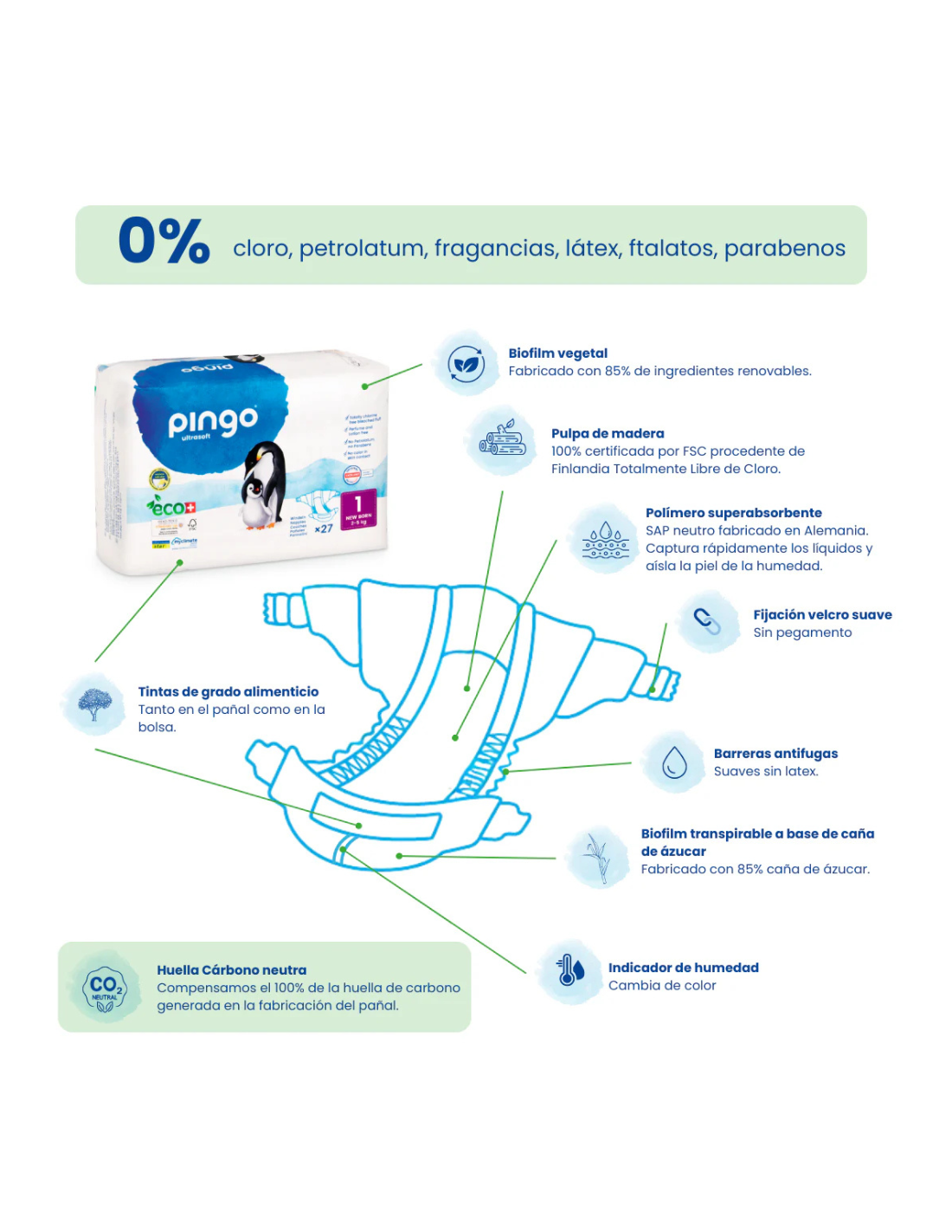 Los pañales Pingo destacan por su enfoque ecológico. Están fabricados con materiales sostenibles y son completamente libres de químicos agresivos, como el cloro o fragancias, lo que los hace perfectos para la piel sensible de los bebés. Además, cuentan con certificaciones que garantizan su respeto por el medio ambiente.