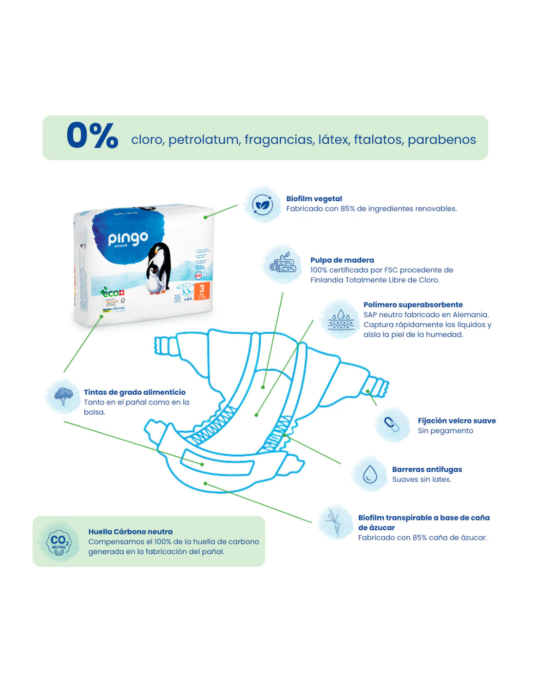 Los pañales ecológicos Pingo son hipoalergénicos, libres de fragancias, lociones, cloro y látex, y cuentan con un ajuste anatómico con elásticos suaves y barreras antifugas. Además, poseen las certificaciones FSC, Dermatest® Excellent y Climate Neutral Product, que garantizan la seguridad y el respeto con el medio ambiente.
