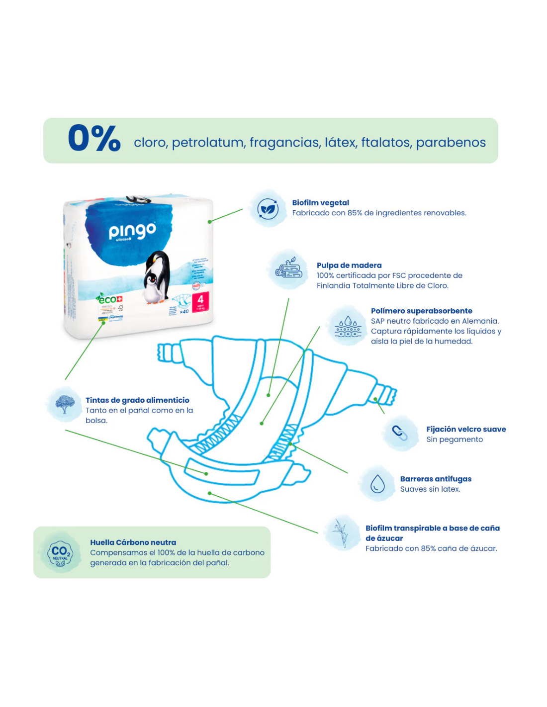 – Núcleo absorbente: Celulosa FSC TCF (sin cloro) y SAP (polímero superabsorbente).