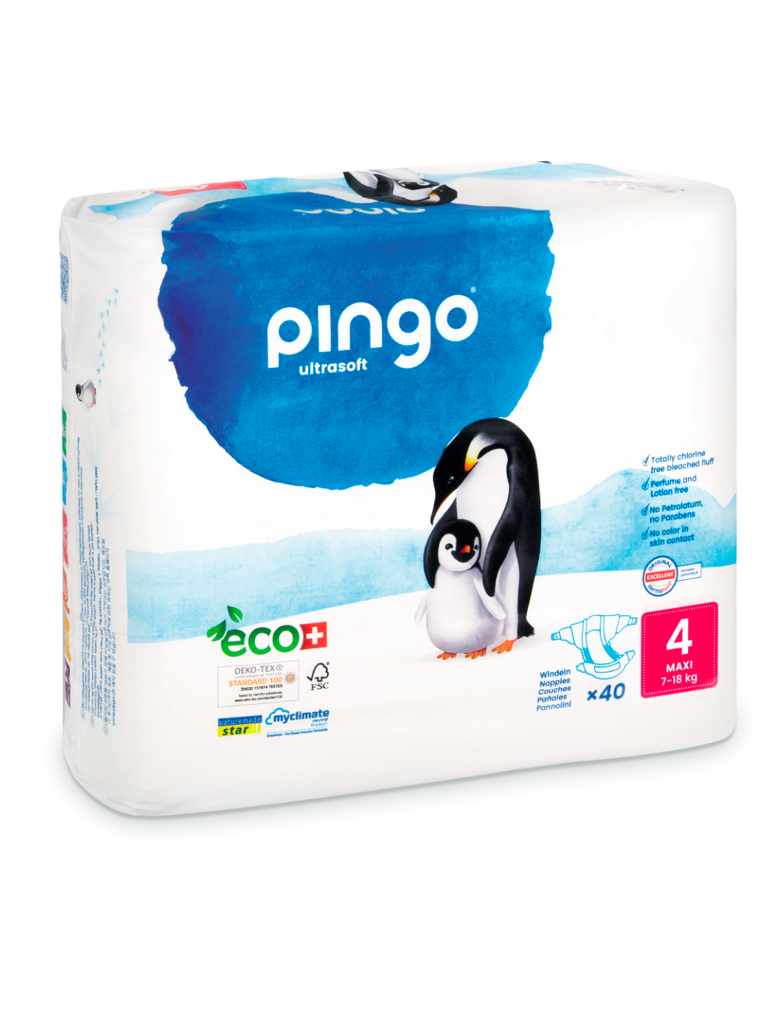 Su núcleo superabsorbente de celulosa certificada FSC TCF (sin cloro) mantiene la piel seca durante horas, incluso durante la noche. La capa interior, de tejido no tejido ultrasuave, permite la transpiración natural de la piel, evitando irritaciones y rojeces. Los pañales Pingo son hipoalergénicos, sin fragancias, sin lociones, sin cloro ni látex, garantizando el máximo cuidado dermatológico.