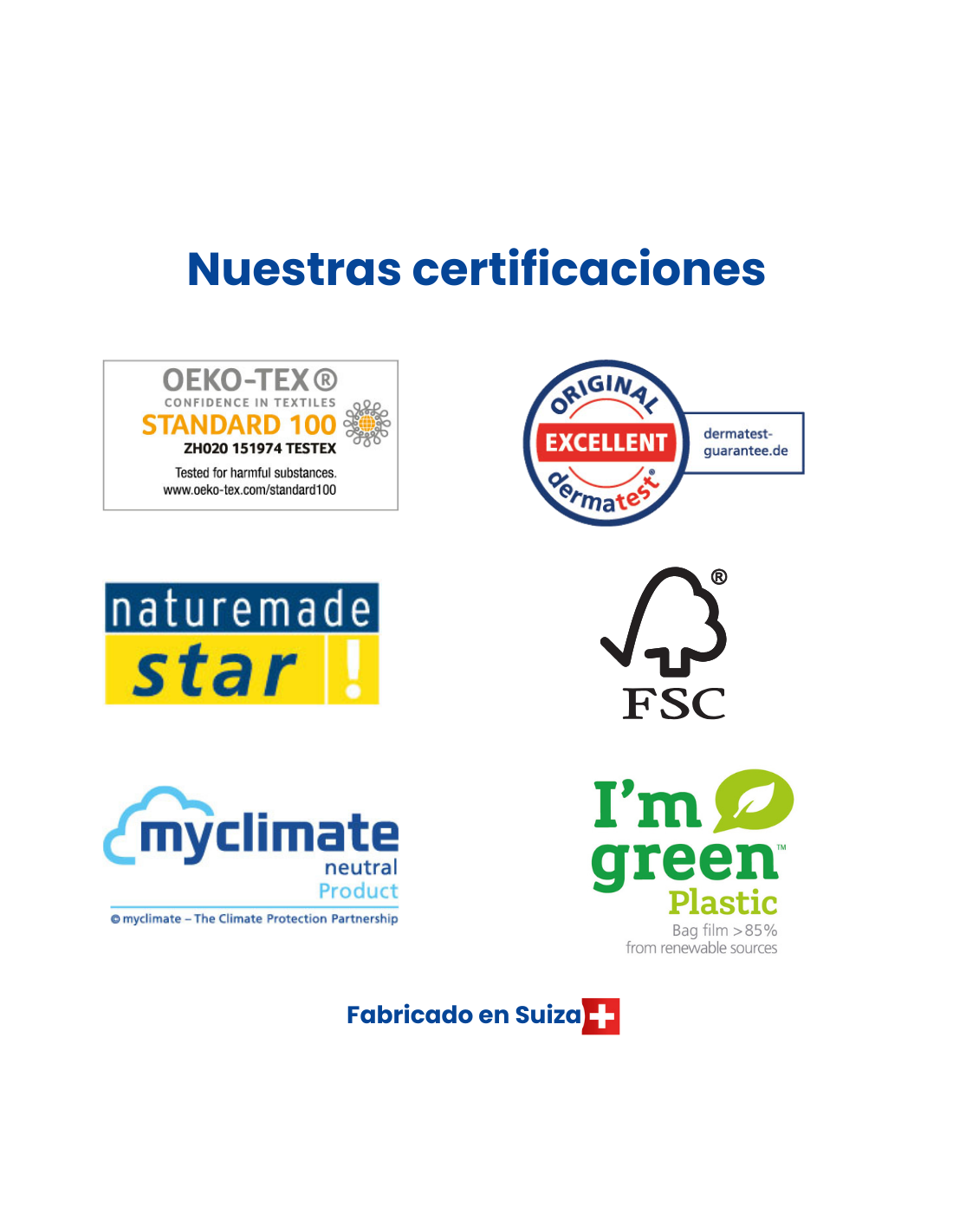 Cumple con la legislación europea en materia de productos higiénicos absorbentes, etiquetado y seguridad dérmica. Dermatológicamente testados, libres de fragancias, cloro, lociones y látex. Certificados FSC, Dermatest Excellent y Climate Neutral Product. Fabricados en Suiza bajo los estándares ISO 9001 (calidad) e ISO 14001 (gestión ambiental).