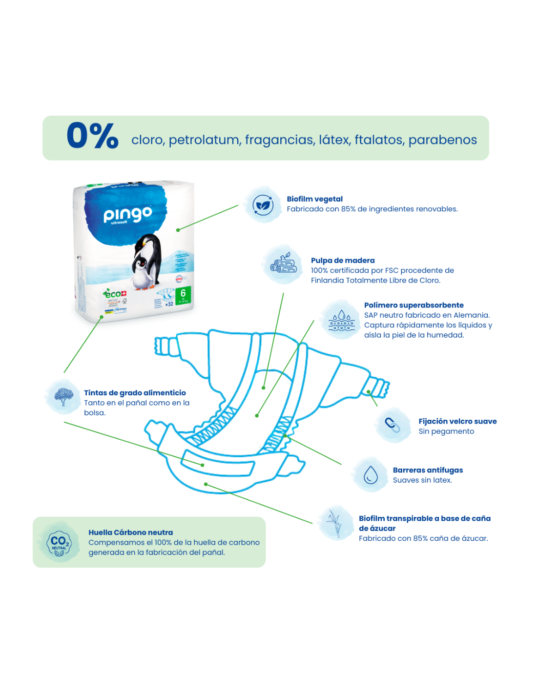 – Núcleo absorbente: celulosa FSC TCF (sin cloro) y SAP (absorbente polimérico).