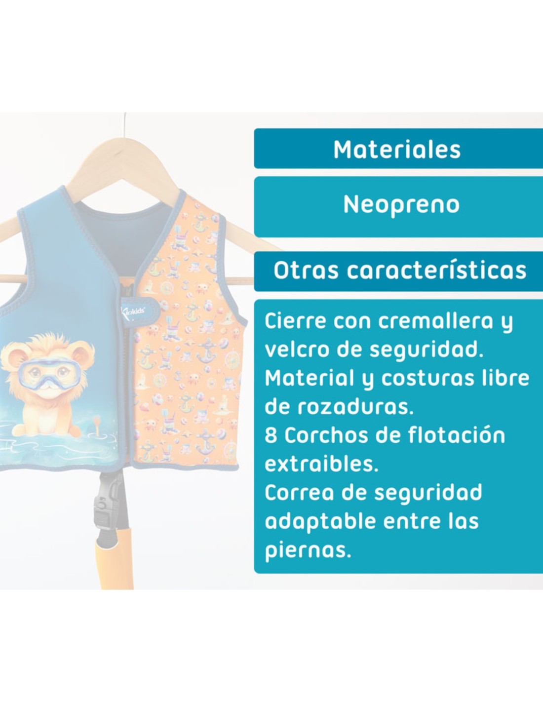 Protección y diversión en el agua: El chaleco de neopreno con diseño de león de Kiokids es ideal para que los niños disfruten del baño o la piscina de manera cómoda y segura. Material de neopreno: Fabricado en neopreno flexible y resistente, mantiene la temperatura corporal y proporciona un ajuste cómodo. Diseño ergonómico: Con cremallera frontal y cierre de seguridad, permite ponerlo y quitarlo fácilmente. Decoración divertida: Estampado de león en colores vivos que convierte el aprendizaje en el agua en una experiencia atractiva. Seguridad: Proporciona flotabilidad adicional, favoreciendo la confianza del niño en el agua (no sustituye a los sistemas de seguridad homologados). Talla S: Adaptada para bebés y niños pequeños (consultar tabla de tallas del fabricante para rango de peso y altura).