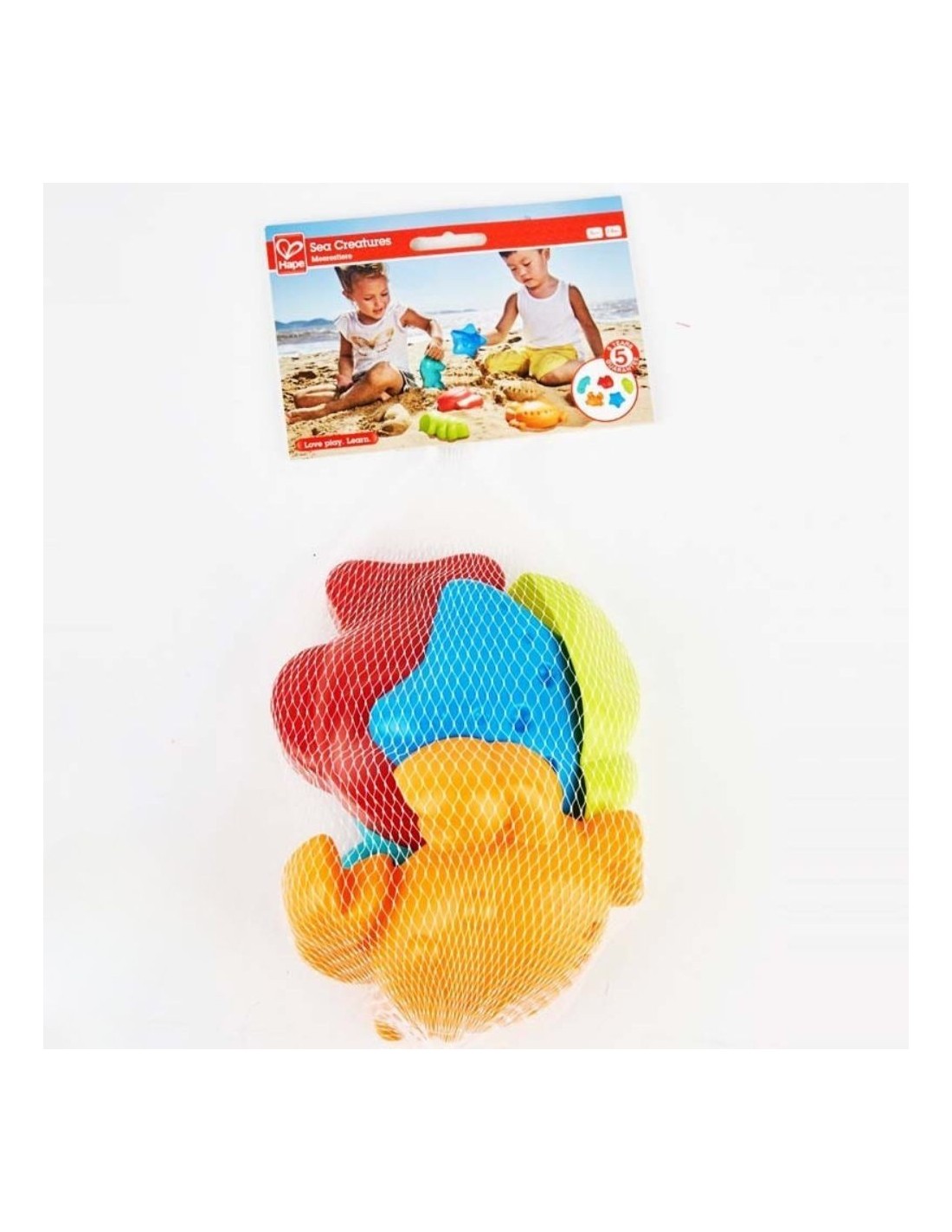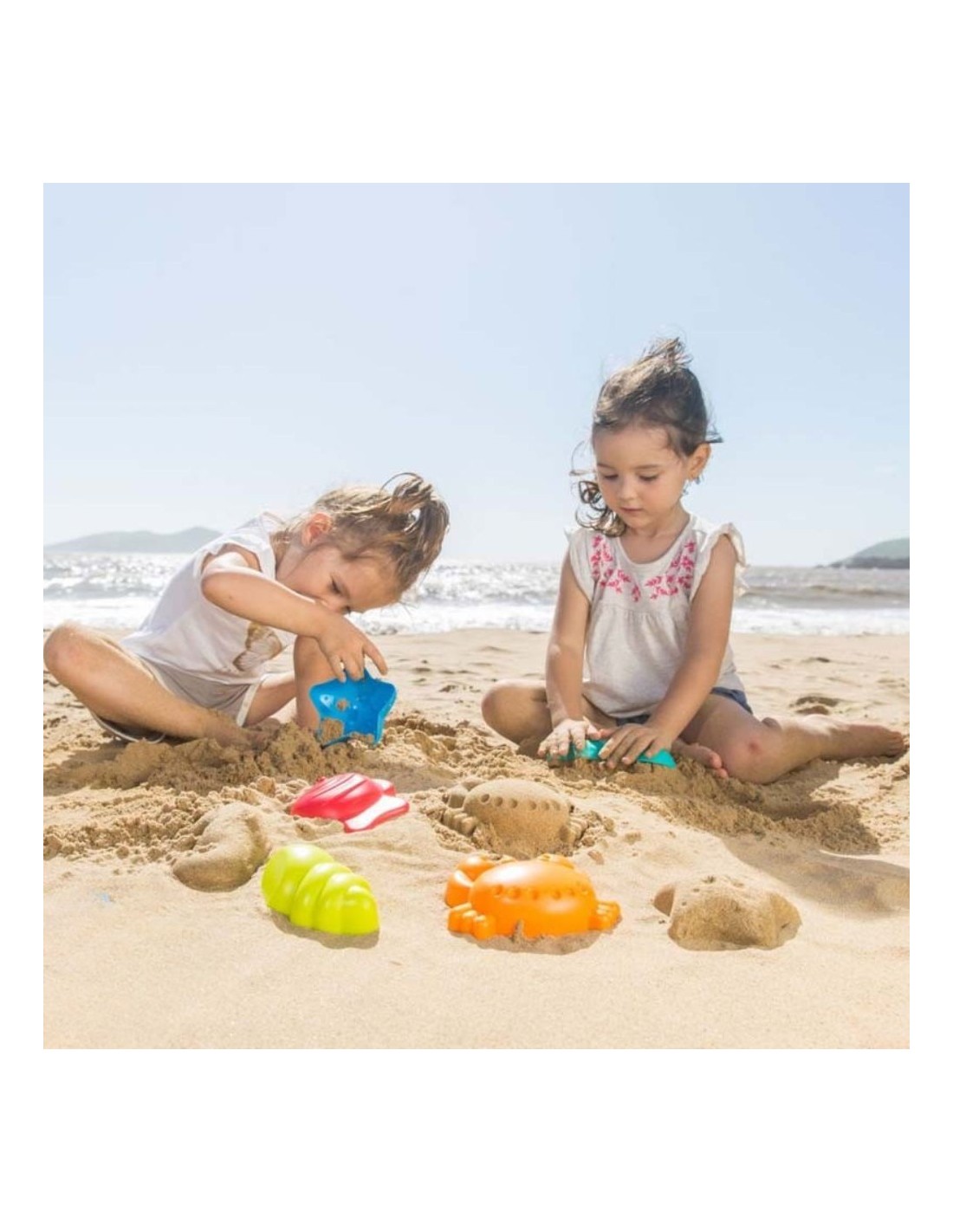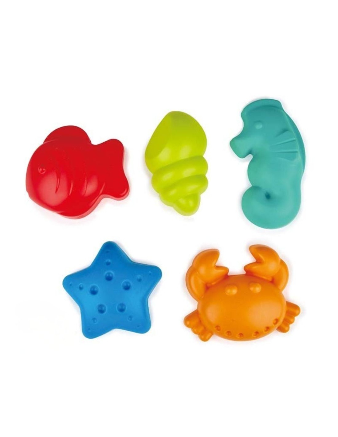 Incluye 5 moldes con formas de habitantes del mar (como estrellas, peces y cangrejos).