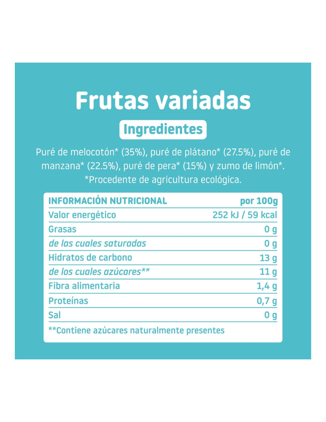 Elaborado con frutas 100% ecológicas , este sobre no contiene azúcares añadidos, conservantes ni colorantes artificiales , asegurando una experiencia natural y saludable. Su fórmula mantiene todas las propiedades nutricionales de la fruta , ofreciendo un aporte de vitaminas, minerales y fibra , esenciales para el crecimiento y desarrollo del bebé.