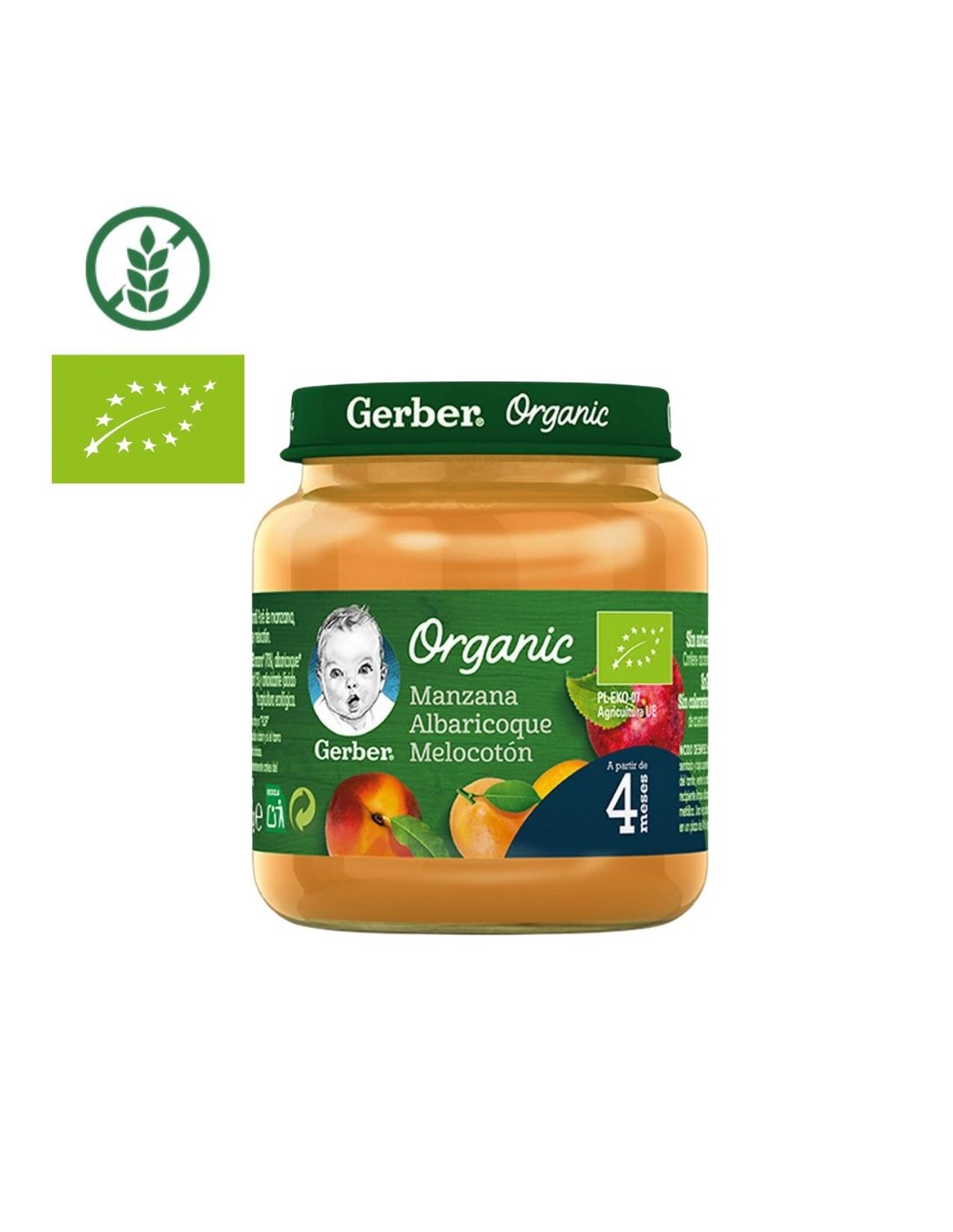 El Potito Manzana, Albaricoque y Melocotón 125 g 4M+ Gerber ofrece una deliciosa mezcla de frutas ecológicas cuidadosamente seleccionadas y cocinadas al vapor para conservar su sabor y sus nutrientes naturales. Perfecto para los primeros meses de alimentación complementaria, combina la dulzura de la manzana con la suavidad del melocotón y el toque afrutado del albaricoque, resultando en un puré de sabor equilibrado, natural y de textura muy fina. Elaborado con ingredientes de agricultura ecológica certificada, sin azúcares añadidos, sin gluten ni conservantes. Un producto 100 % natural que respeta las necesidades del bebé y favorece una alimentación saludable y segura.