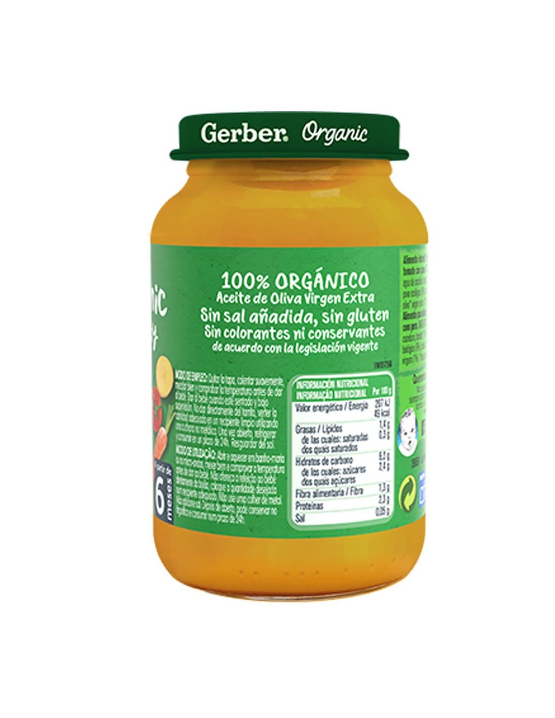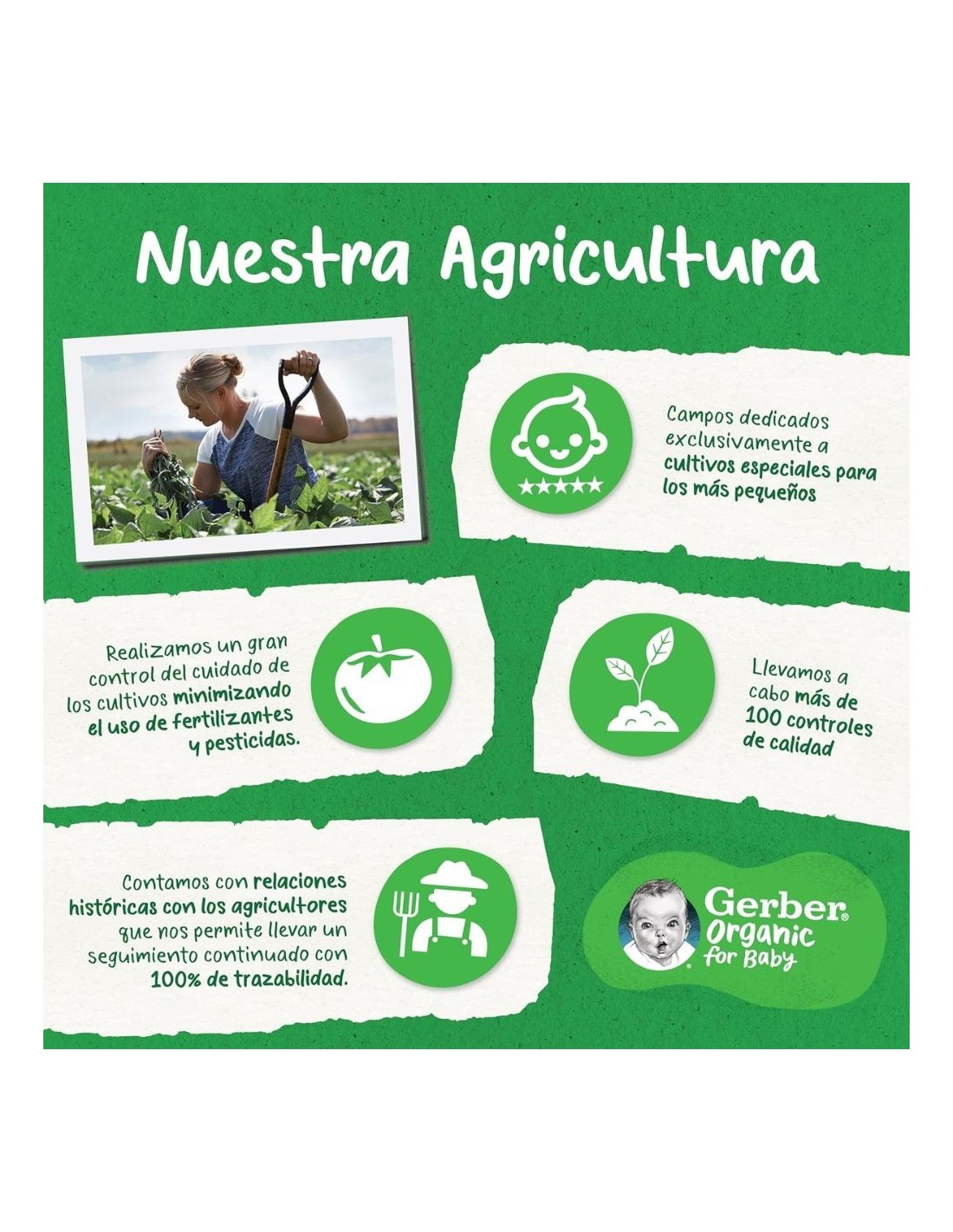 Los purés orgánicos, como este de Gerber, están libres de pesticidas, conservadores y otros aditivos químicos, lo que asegura una alimentación limpia y saludable para el bebé, respetando su sistema digestivo.