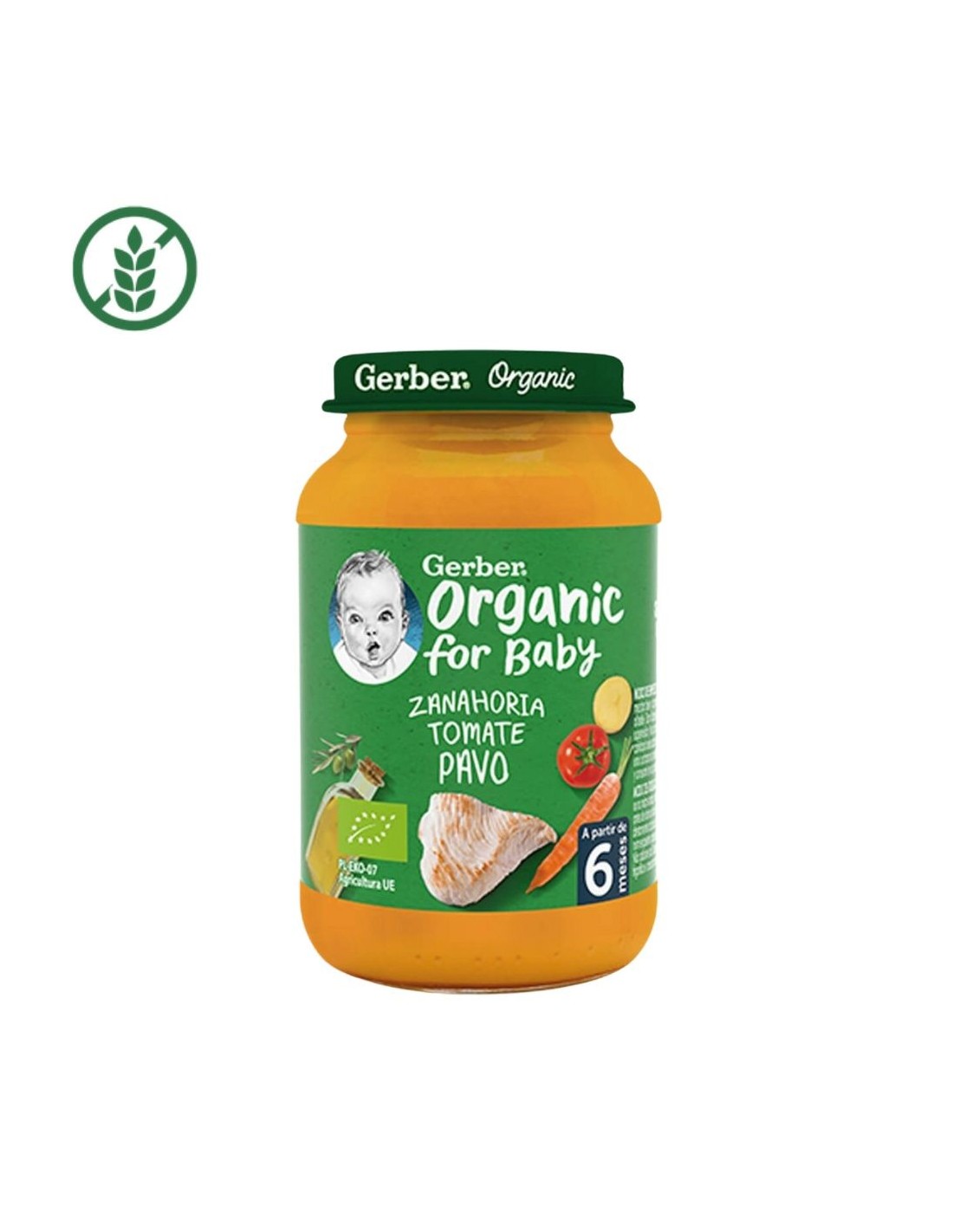 El Potito Zanahoria, Tomate y Pavo 190 g 6M+ Gerber combina verduras ecológicas con carne de pavo de alta calidad para ofrecer una comida completa, equilibrada y adaptada a la etapa de alimentación del bebé a partir de los 6 meses. Cocinado al vapor para mantener intactos los nutrientes y el sabor natural, este puré es 100 % ecológico, sin sal ni azúcares añadidos, y sin conservantes. Su textura homogénea y cremosa facilita la digestión y estimula el gusto del bebé por los sabores naturales. Una receta rica en vitamina A y proteínas, perfecta para una alimentación sana, segura y equilibrada.