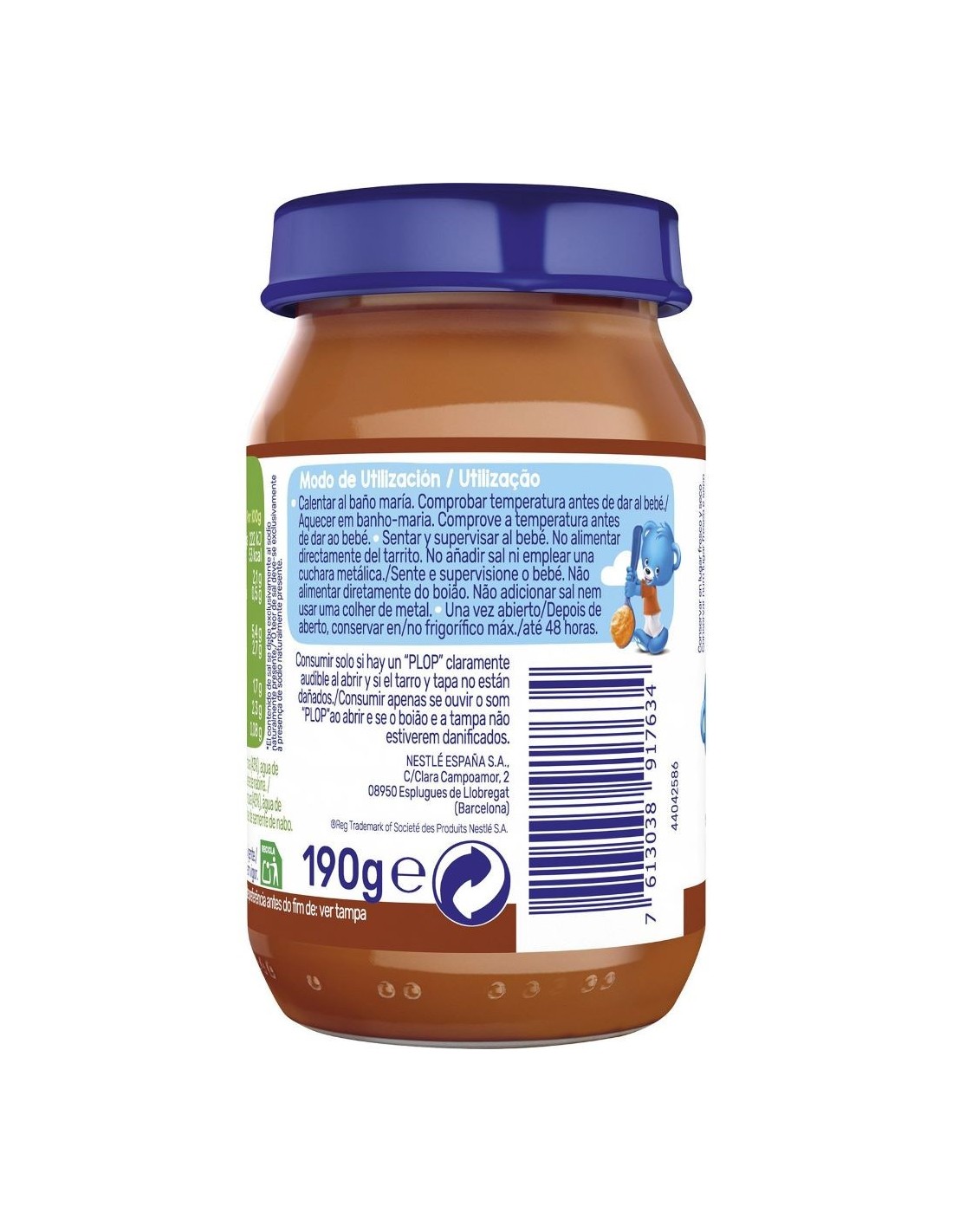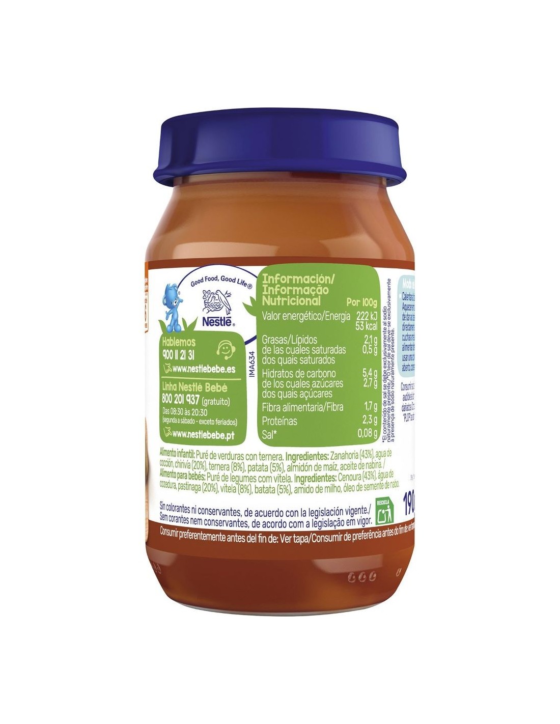 Elaborado sin sal añadida, colorantes, conservantes ni gluten, garantiza una digestión ligera y una alimentación segura y natural. Desarrollado por Nestlé Baby & Me, este potito proporciona un aporte equilibrado de proteínas, hierro y vitaminas, esenciales para el crecimiento y el desarrollo del bebé.