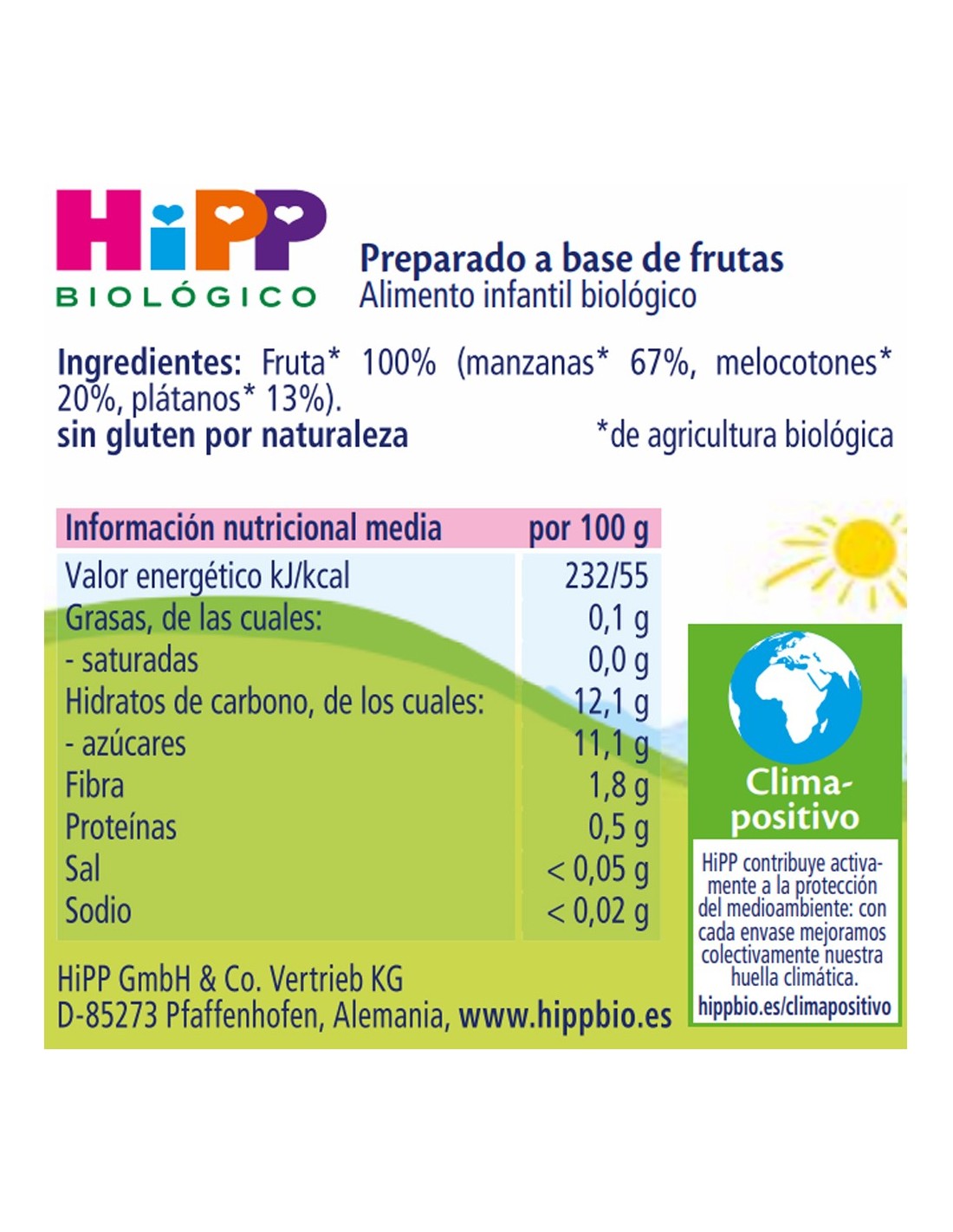 Fruta 100% (manzanas* 67% , melocotones* 20% , plátanos 13%*. *de agricultura biológica Valores Nutricionales por 100 gramos: Valor energético: 232 kj / 55 kcal. Grasas: 0.1gr Hidratos de Carbono: 12.1 gr (azúcares: 11.1gr) Fibra: 1.8 gr Proteínas: 0.5 gr Sal: < 0.05 gr Sosio: < 0.02 gr El Sello Orgánico HiPP garantiza la más alta calidad y excede los requisitos legales para la producción orgánica. Todos los productos de HiPP están sometidos a una doble certificación BIO más la reglamentación en alimentación infantil y se elaboran sin conservantes, sustancias aromáticas sintéticas ni colorantes y carecen de ingredientes alterados genéticamente. Sin OMG (Organismos Modificados Genéticamente) de acuerdo con la regulación europea en la producción biológica.