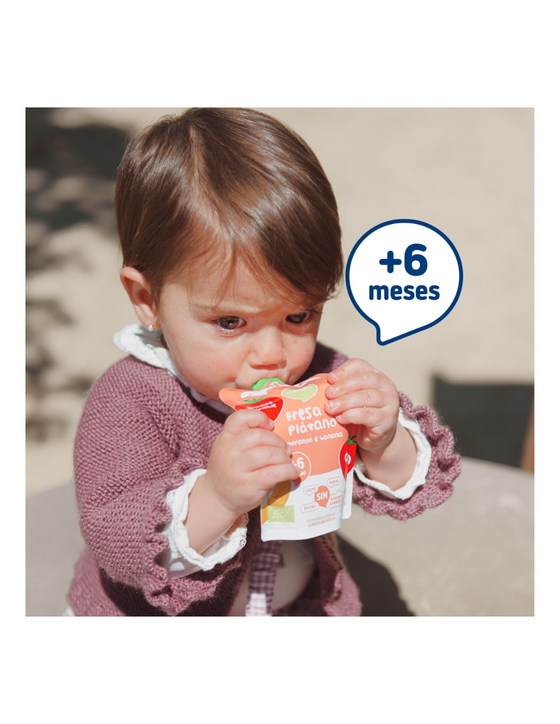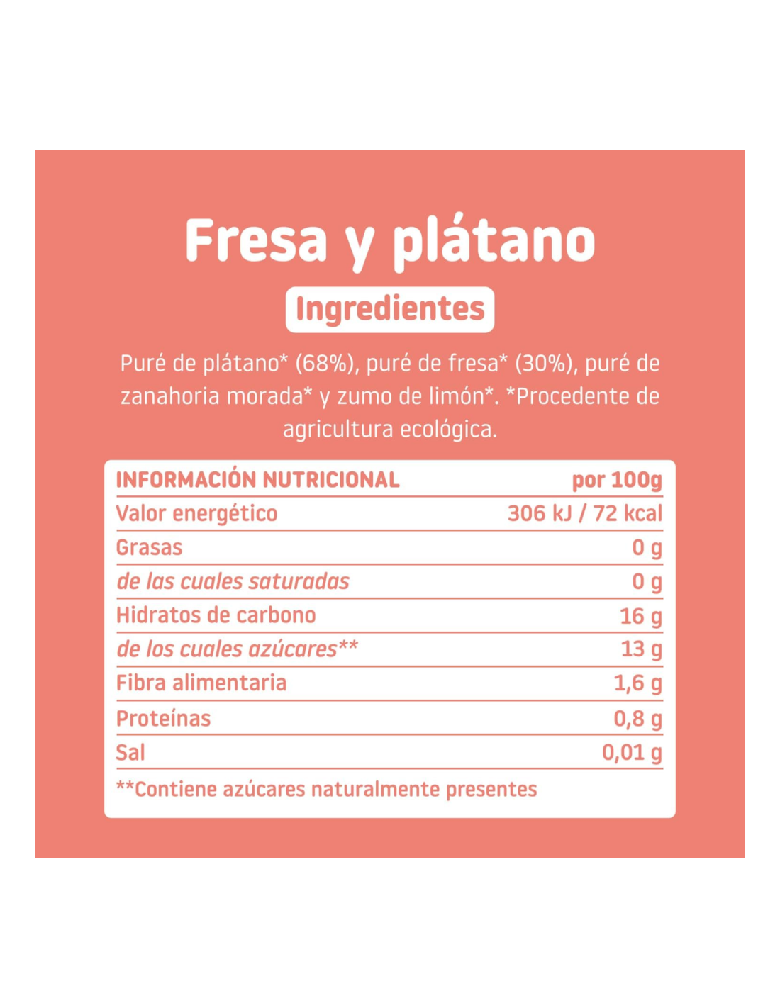 Elaborado únicamente con fruta ecológica , este sobre no contiene conservantes, colorantes, ni azúcares añadidos , respetando al máximo la calidad y el sabor natural de los ingredientes. Su textura suave y fácil de ingerir lo convierte en la opción perfecta para la alimentación complementaria del bebé, aportando todos los nutrientes esenciales de la fresa y el plátano .