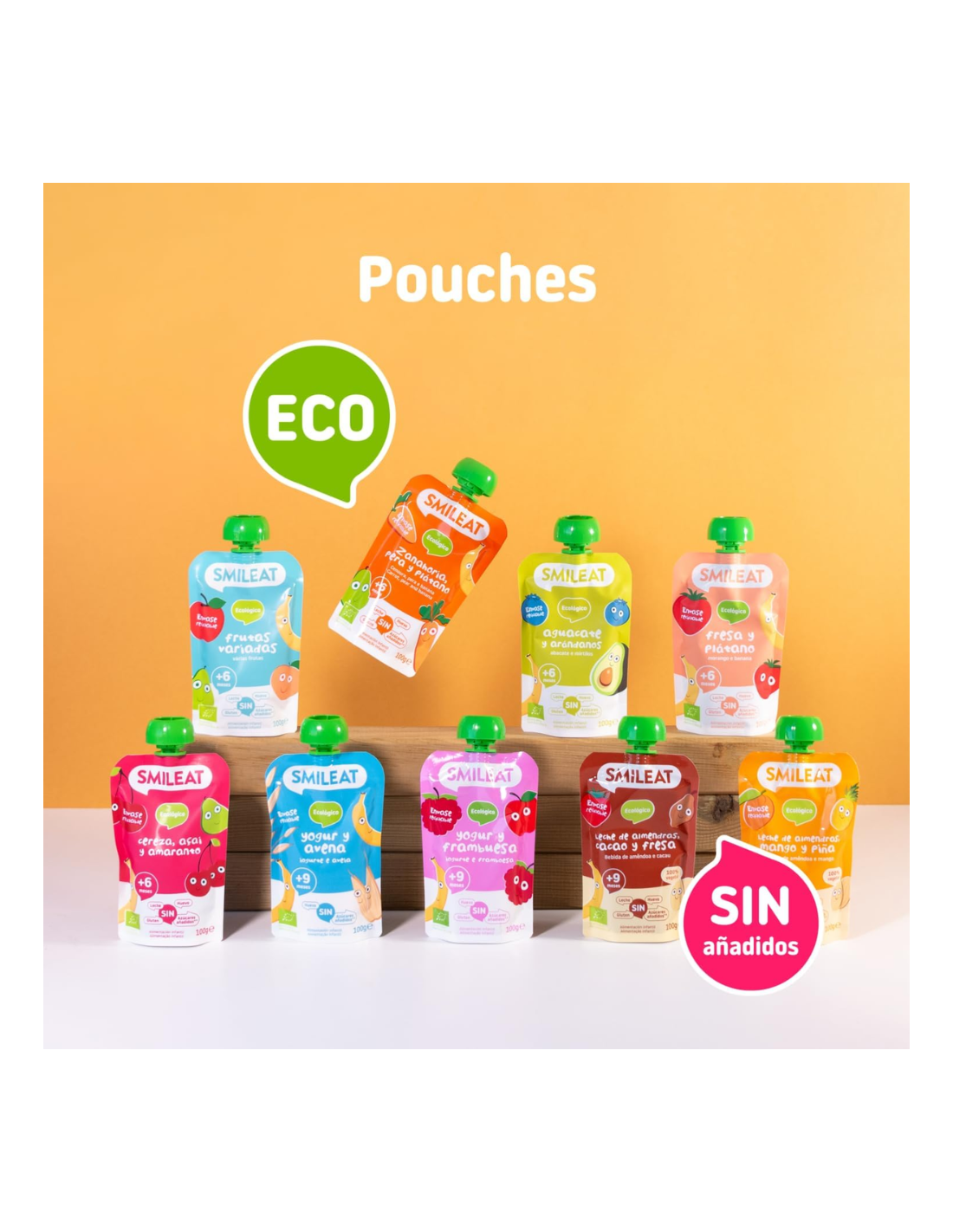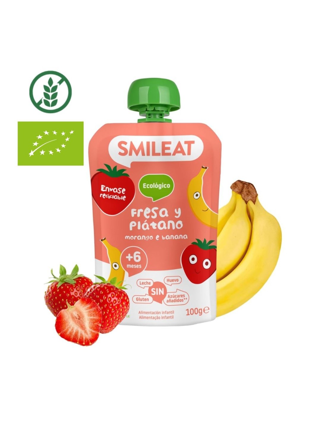 Su envase práctico y seguro permite que sea fácil de llevar a cualquier parte, ofreciendo una solución rápida y saludable para la merienda o el almuerzo. Además, el Pouch de Fresa y Plátano de Smileat está libre de gluten, lactosa y proteínas de leche , siendo apto para bebés con alergias o intolerancias.