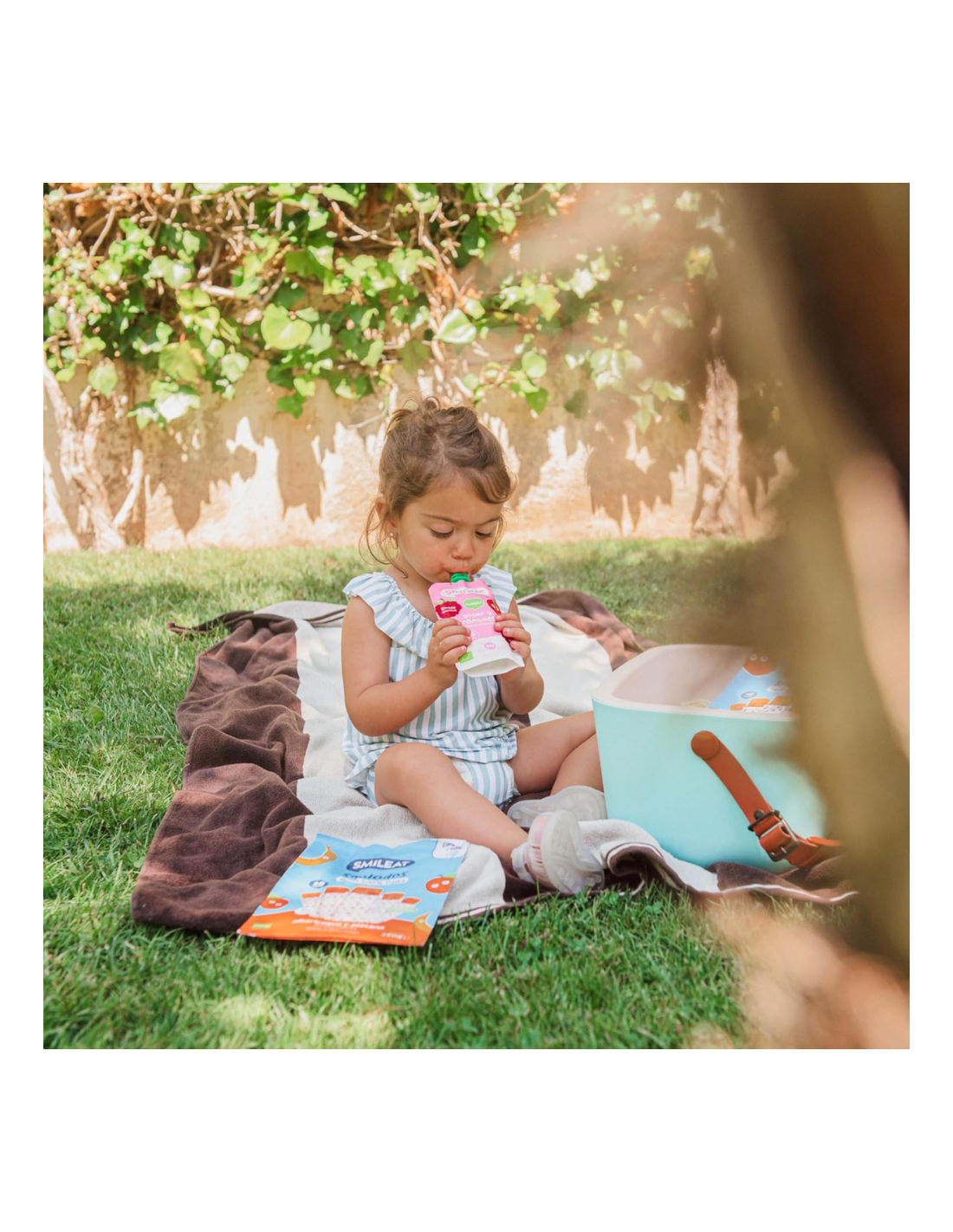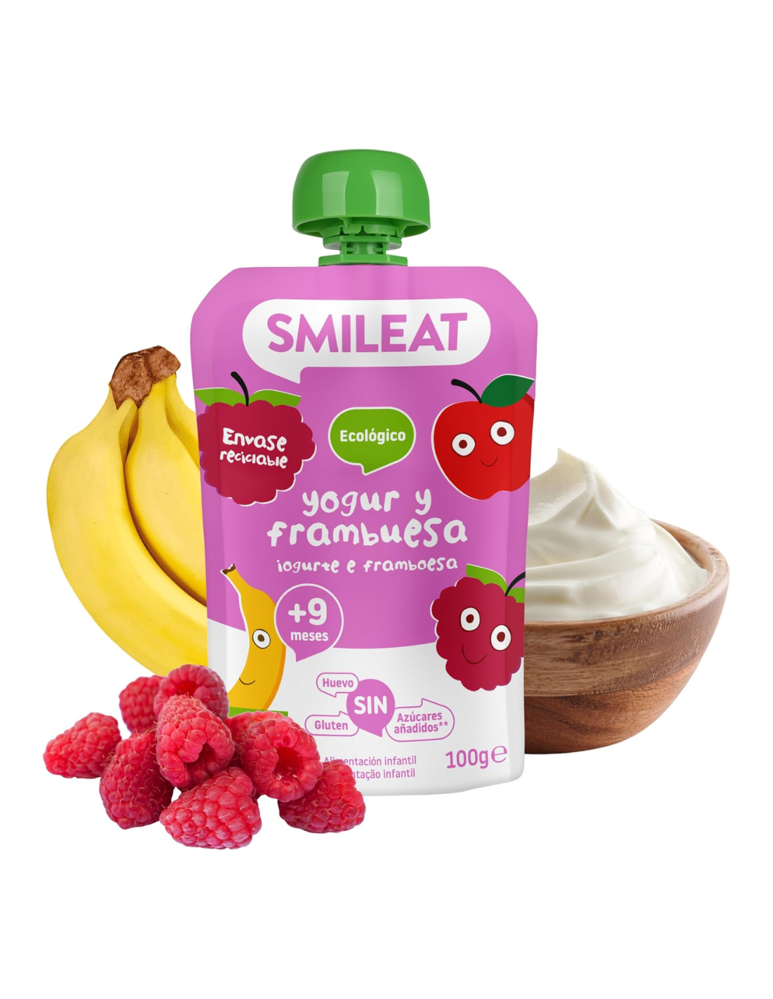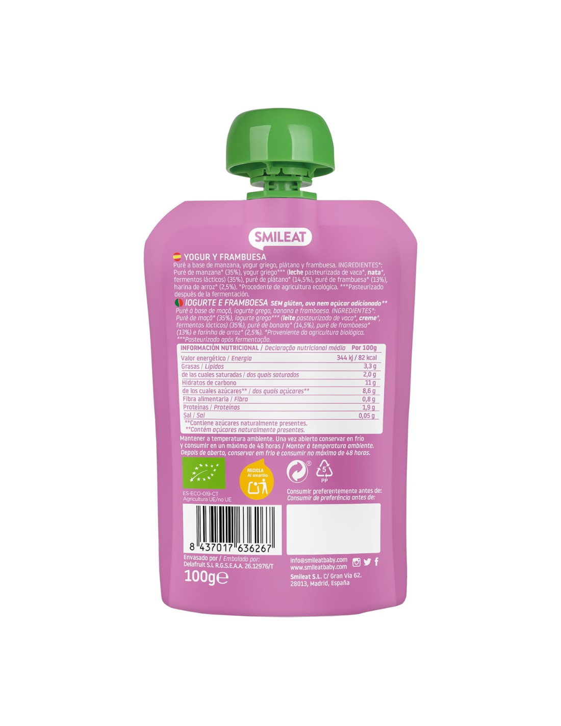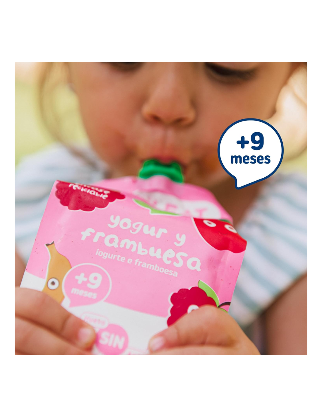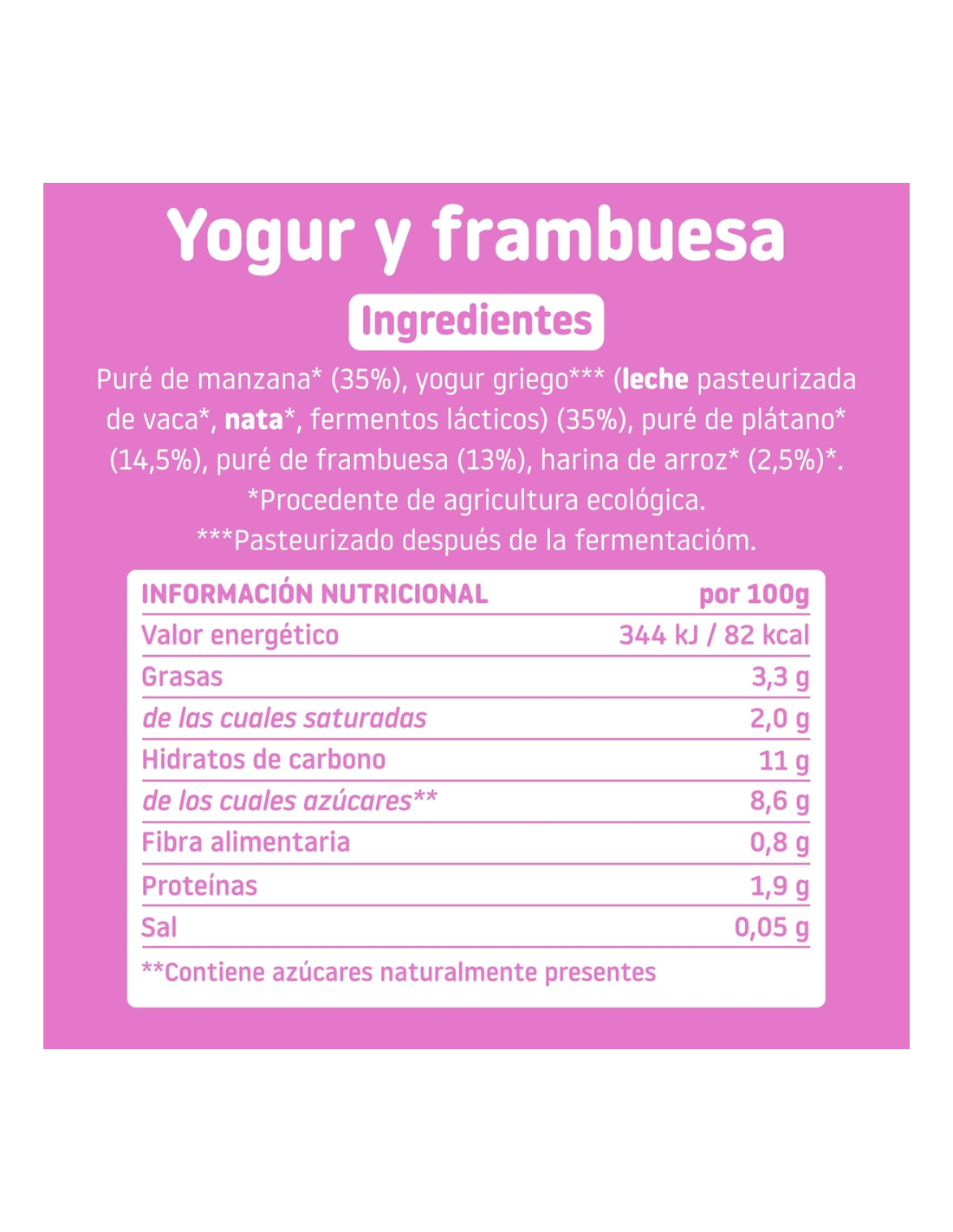 Este pouch está elaborado con frutas ecológicas y yogur natural, sin azúcares añadidos, colorantes ni conservantes artificiales. Su aporte de calcio y probióticos naturales favorece la salud digestiva y el desarrollo óseo del bebé, mientras que la frambuesa es rica en antioxidantes y vitamina C, fortaleciendo el sistema inmunológico.