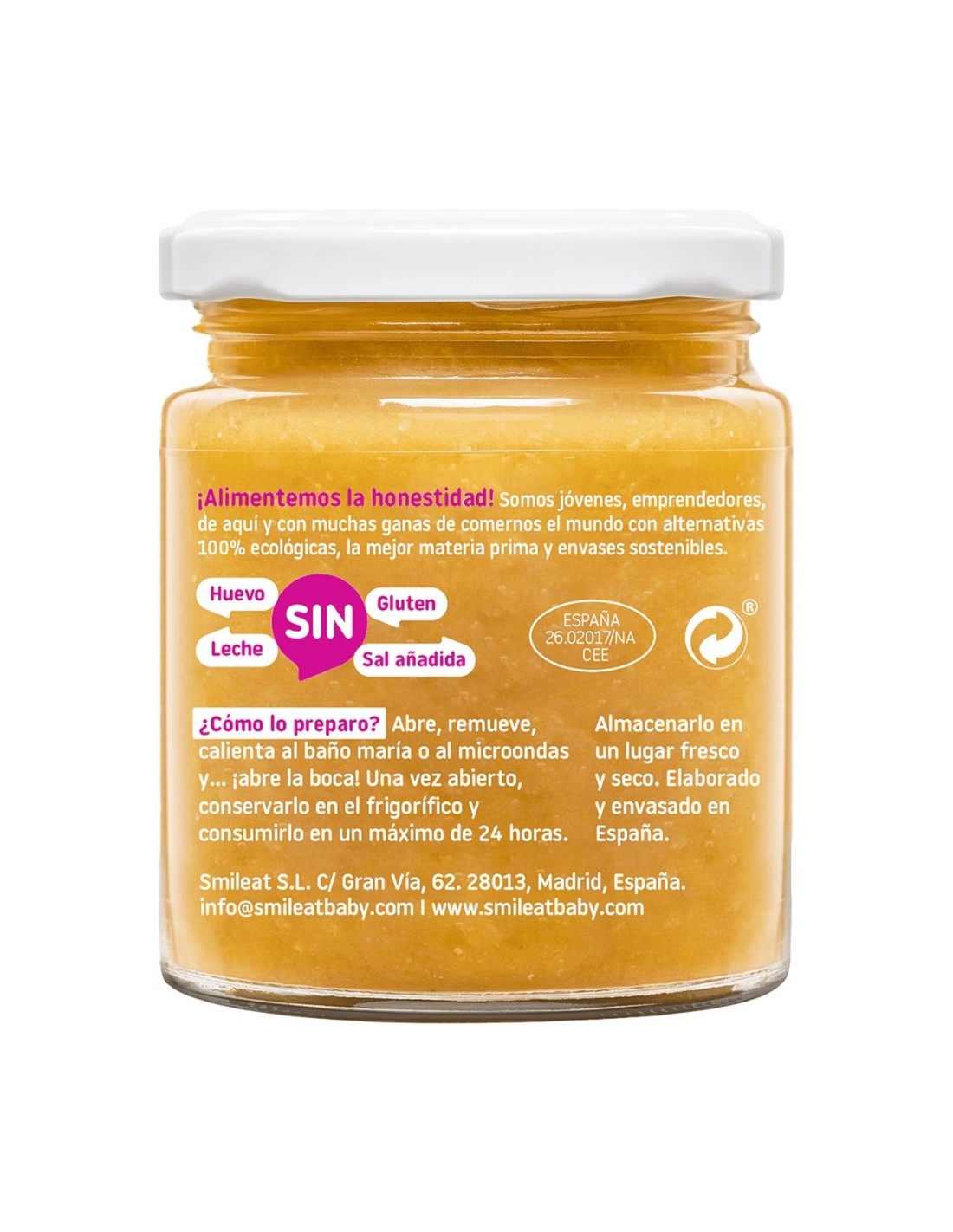 No contiene sal añadida, azúcares, conservantes ni colorantes , manteniendo el sabor auténtico y los beneficios naturales de los alimentos. Además, su envase de vidrio reciclable reafirma el compromiso de Smileat con la sostenibilidad y el respeto por el medio ambiente.
