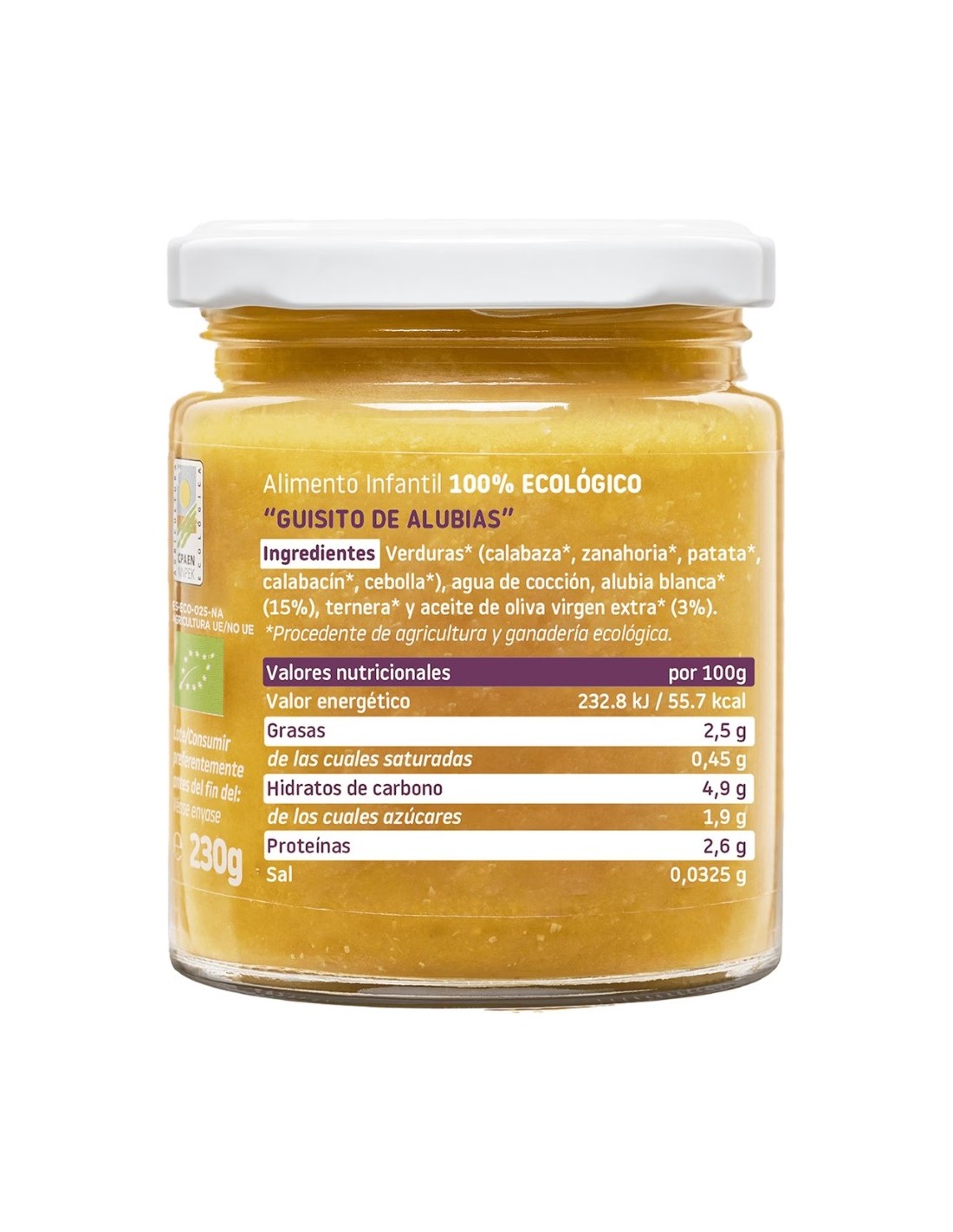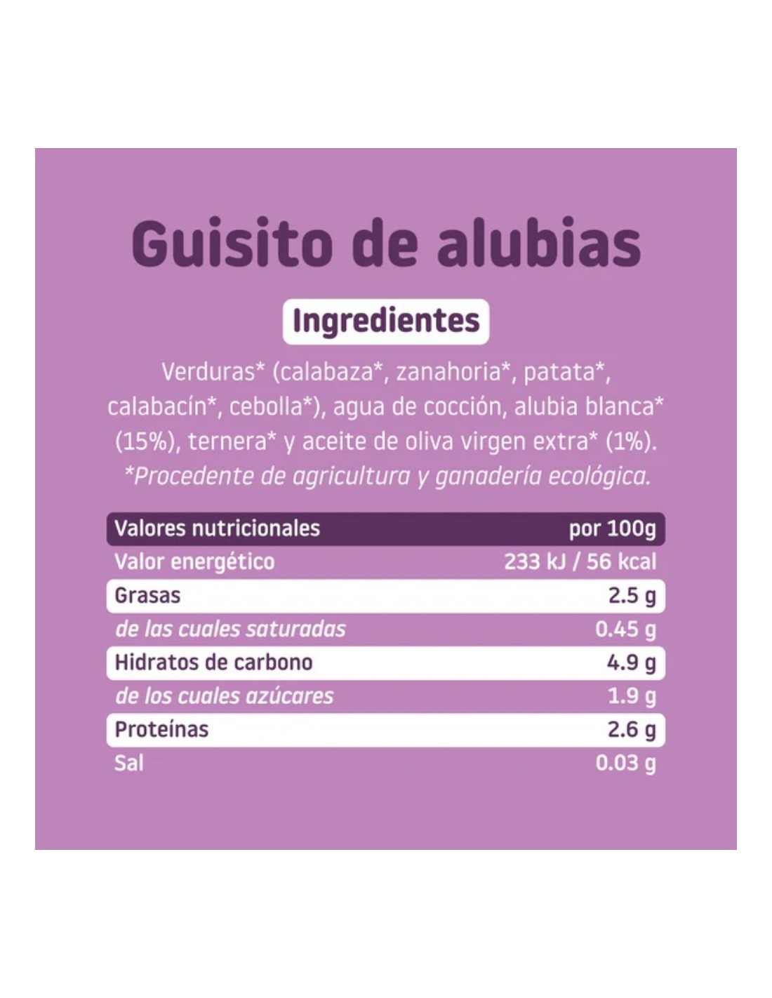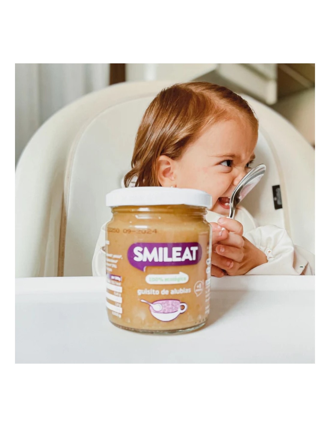 El Potito Guisito de Alubias Ecológico - Smileat está elaborado con legumbres y verduras de agricultura ecológica , sin pesticidas ni productos químicos artificiales, asegurando la máxima calidad. Su combinación de ingredientes ofrece un aporte óptimo de proteínas vegetales, carbohidratos y minerales , fundamentales para el crecimiento del bebé.