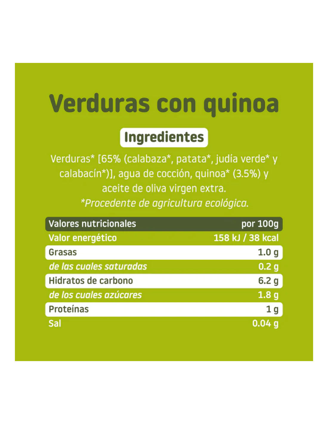 Este tarrito está formulado con una mezcla de verduras ecológicas , cuidadosamente seleccionadas para aportar fibra, vitaminas y minerales esenciales. La quinoa, es un superalimento altamente nutritivo, proporciona una fuente rica en proteínas y aminoácidos esenciales , favoreciendo un crecimiento saludable. Sin azúcares añadidos , conservantes ni colorantes, este tarrito garantiza un sabor 100% natural y una digestión fácil para el bebé. Además, su cocción al vapor conserva mejores nutrientes, manteniendo su frescura y propiedades originales.