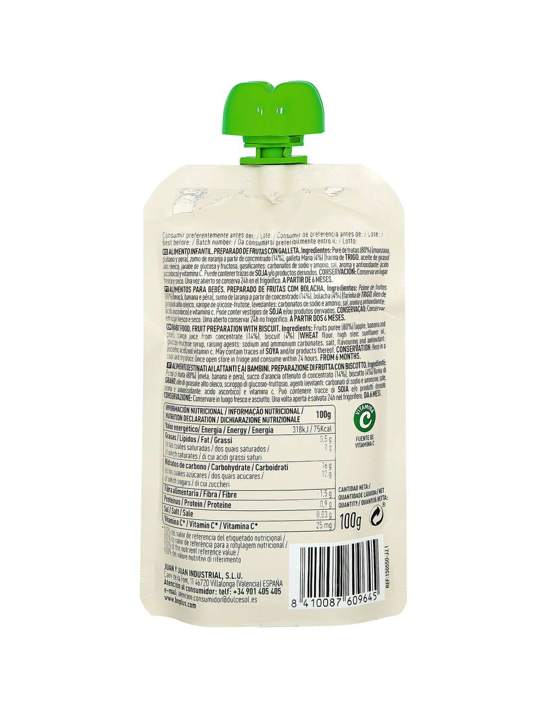 Ingredientes (aprox., 100% naturales): puré de manzana (60%), plátano (20%), pera (10%), galleta molida (8% – contiene cereales con gluten), antioxidante: ácido ascórbico.