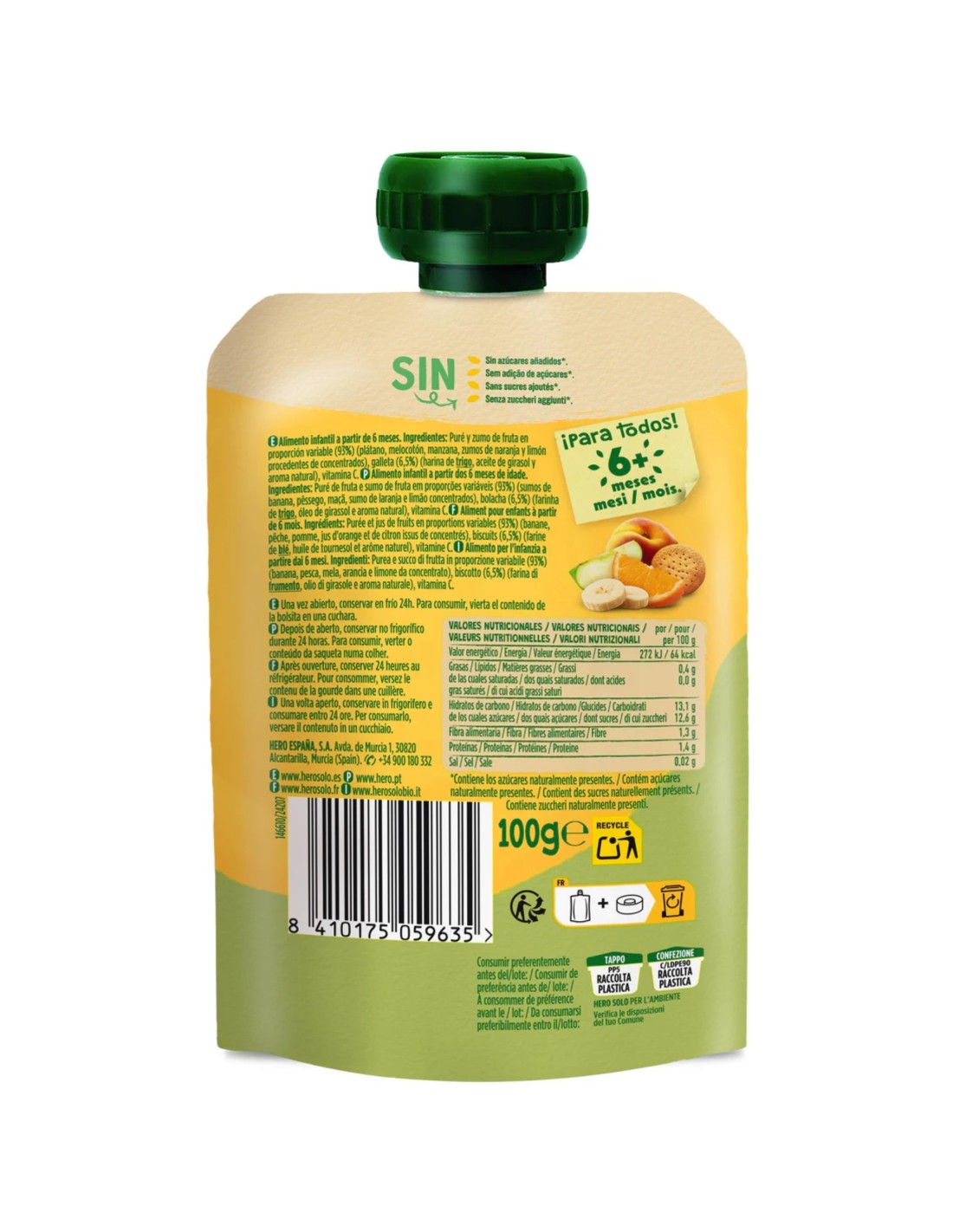 Esta bolsita de multifrutas contiene una equilibrada mezcla de frutas naturales con el toque suave de galletas, ofreciendo una textura cremosa y un sabor delicioso. Es sin gluten, por lo que es adecuada para bebés en sus primeros meses de alimentación complementaria. Gracias a su cierre hermético, es perfecta para llevar a cualquier parte y garantizar una alimentación sana y equilibrada para tu bebé.