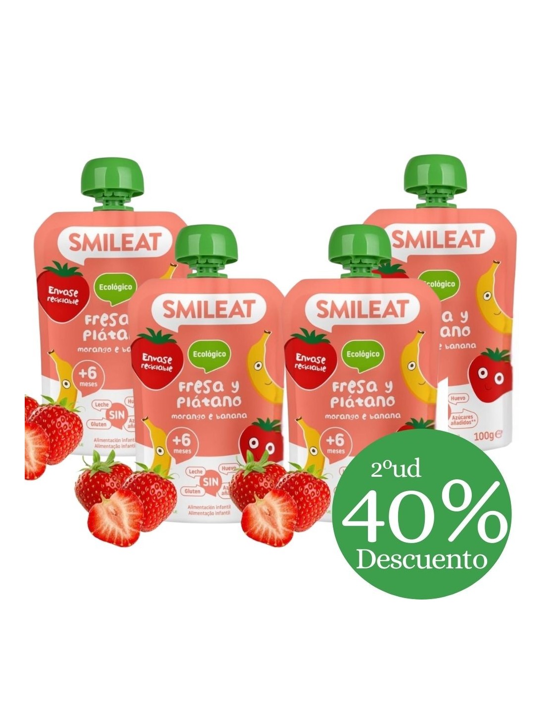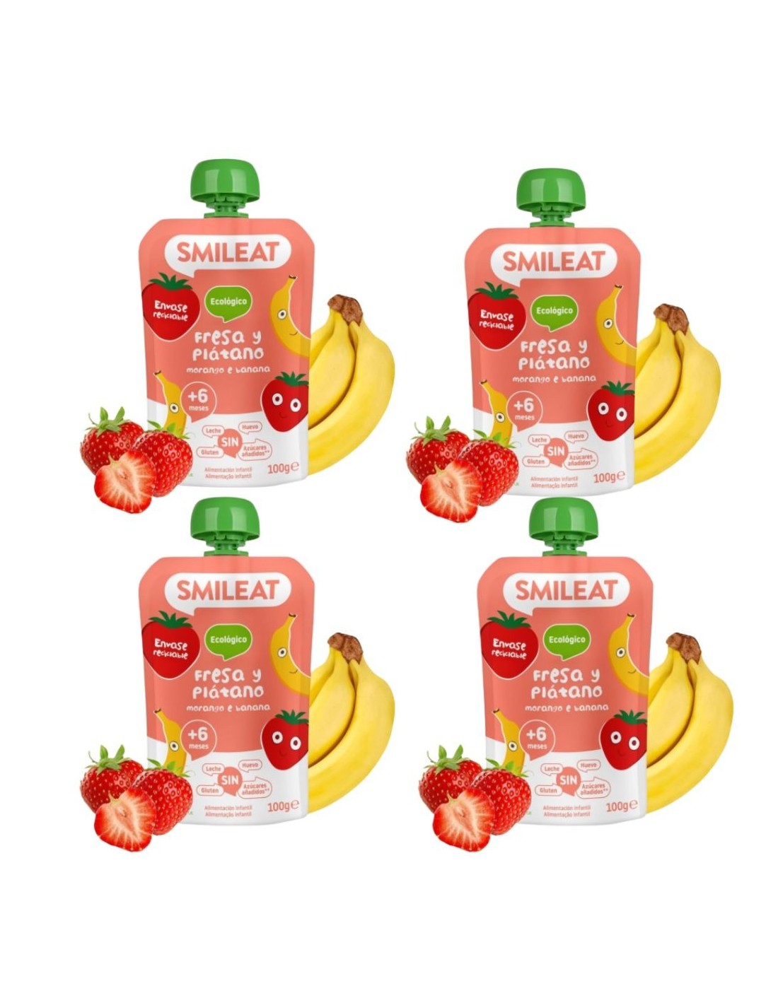 Su envase práctico y seguro permite que sea fácil de llevar a cualquier parte, ofreciendo una solución rápida y saludable para la merienda o el almuerzo. Además, el Pouch de Fresa y Plátano de Smileat está libre de gluten, lactosa y proteínas de leche , siendo apto para bebés con alergias o intolerancias.