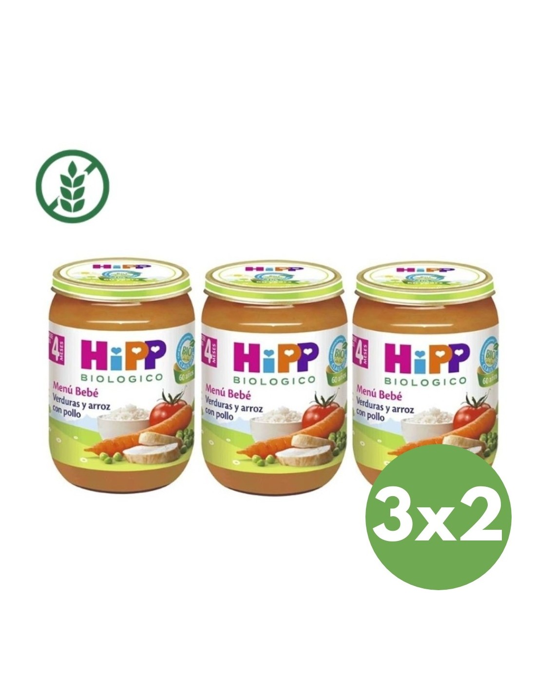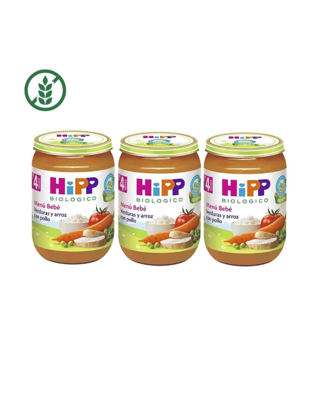 El Pack 3 Potitos Verduras y Arroz con Pollo 190 g 4M+ HiPP Bio es una comida completa y deliciosa pensada para los primeros meses de alimentación complementaria del bebé. Cada potito combina carne de pollo ecológica, arroz suave y verduras naturales (zanahoria, patata y guisante), creando un puré equilibrado y nutritivo, rico en proteínas, hidratos y vitaminas.