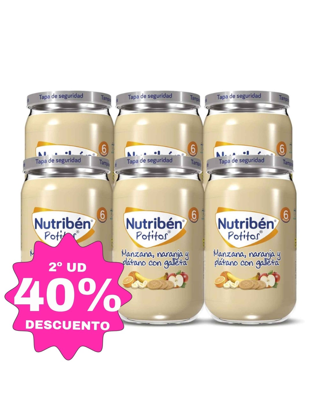 El Potito Manzana, Naranja y Plátano con Galleta +6M Nutribén está elaborado con frutas seleccionadas y galleta infantil, para proporcionar un sabor suave y una textura cremosa ideal para los bebés a partir de 6 meses.