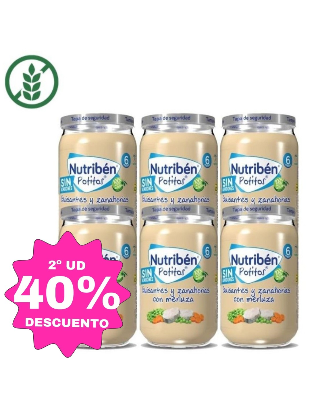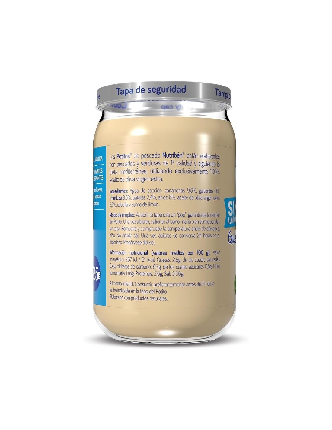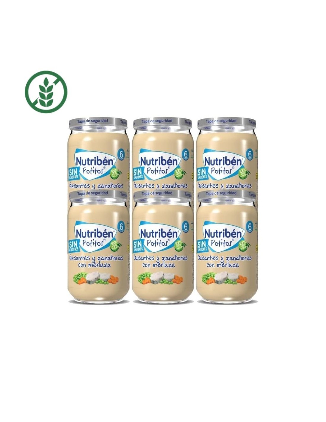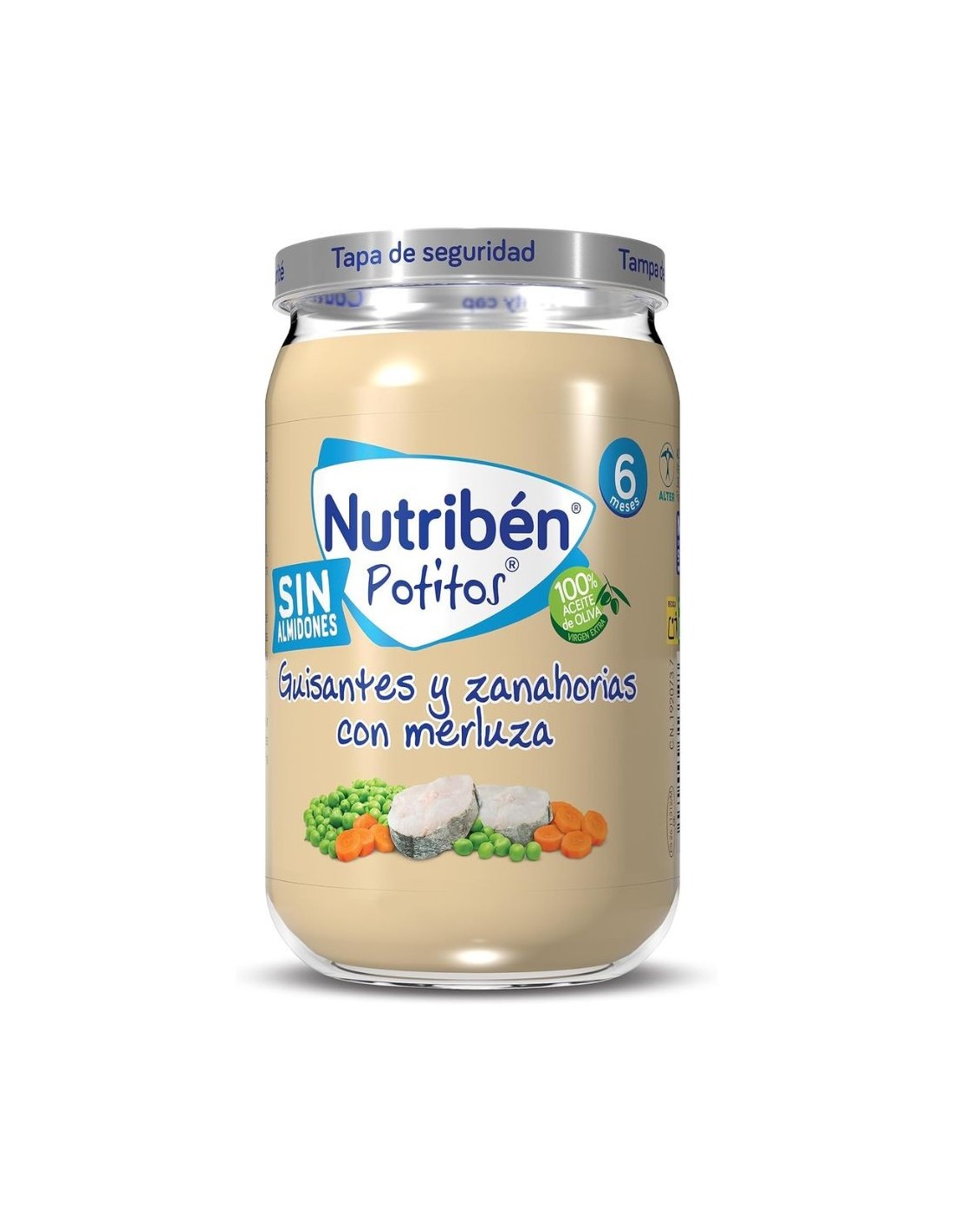 Los Potitos Nutribén Suprema de Merluza, Guisantes y Zanahoria están especialmente formulados para bebés desde los 6 meses, cuando se inicia la introducción del pescado en su dieta.