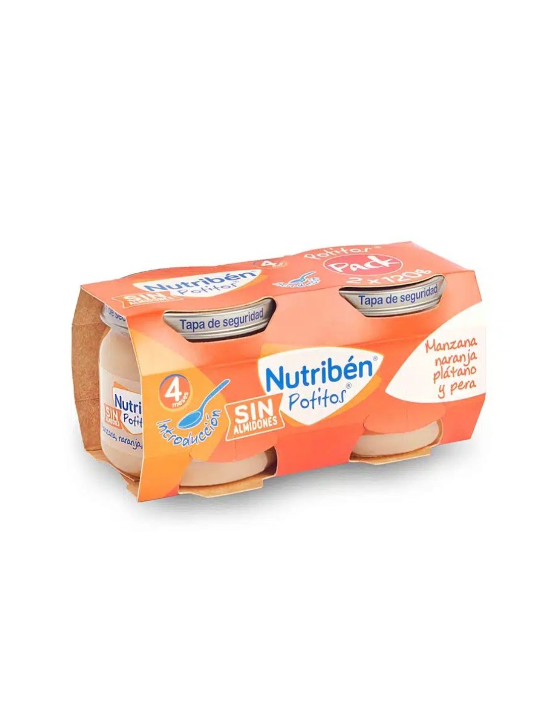 El Bipack de Potitos de Manzana, Naranja, Plátano y Pera Nutribén es ideal para bebés a partir de 4 meses.