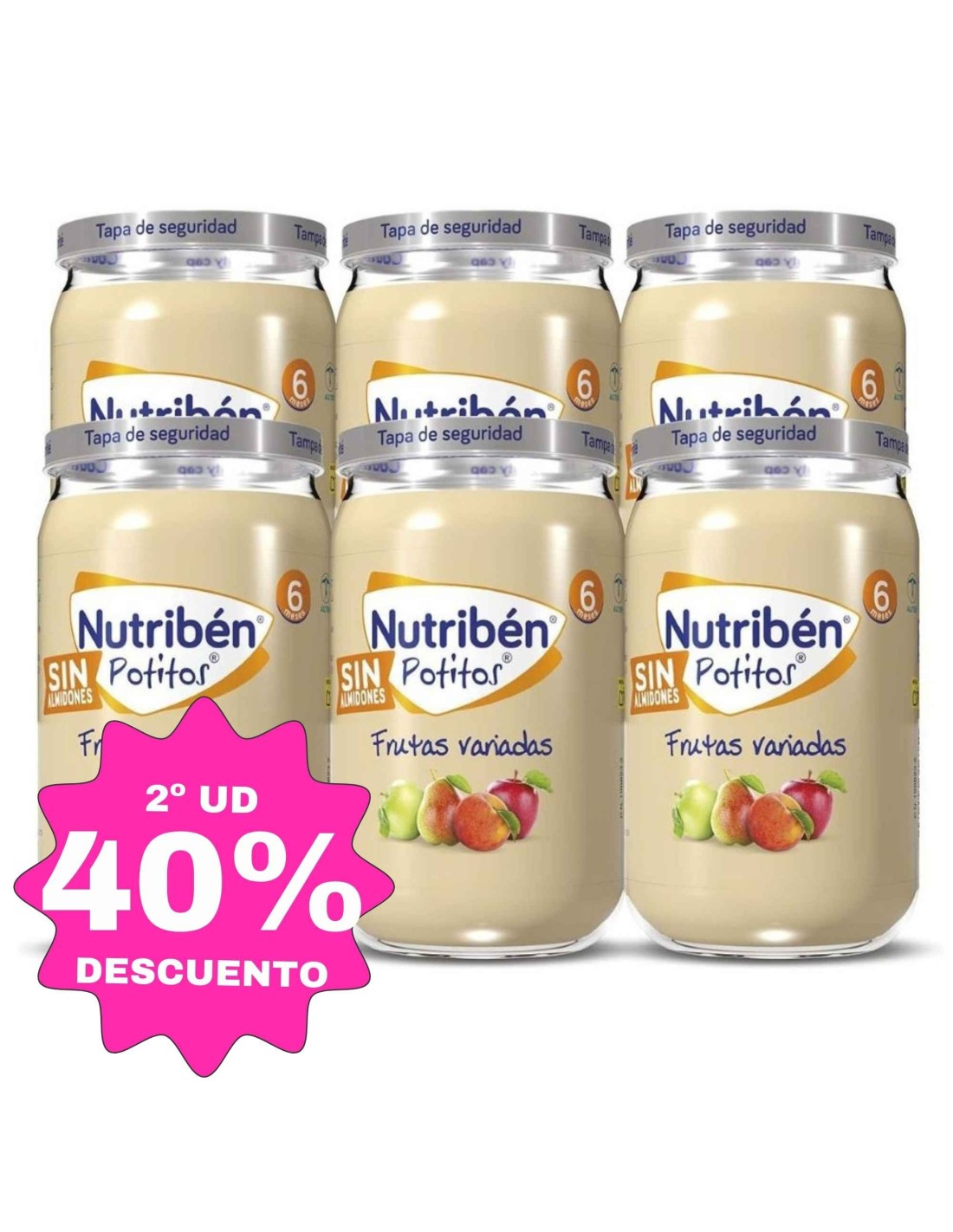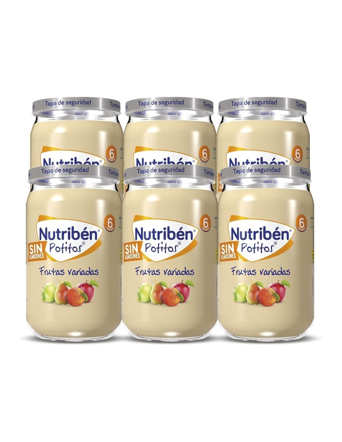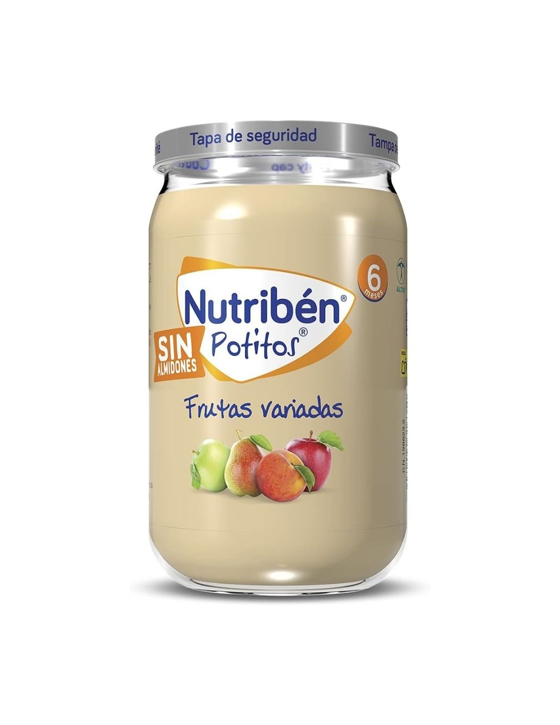 Los Potitos Nutribén Frutas Variadas son un postre natural, equilibrado y sabroso, elaborado con una selección de frutas frescas cuidadosamente elegidas (manzana, pera, plátano, melocotón y naranja), que aportan vitaminas, fibra y energía natural.