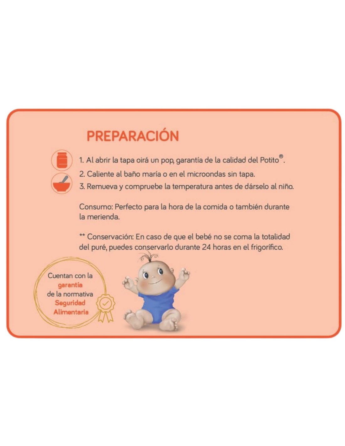 Este potito está diseñado para bebés a partir de los 6 meses , ofreciendo una opción equilibrada y nutritiva para su alimentación.