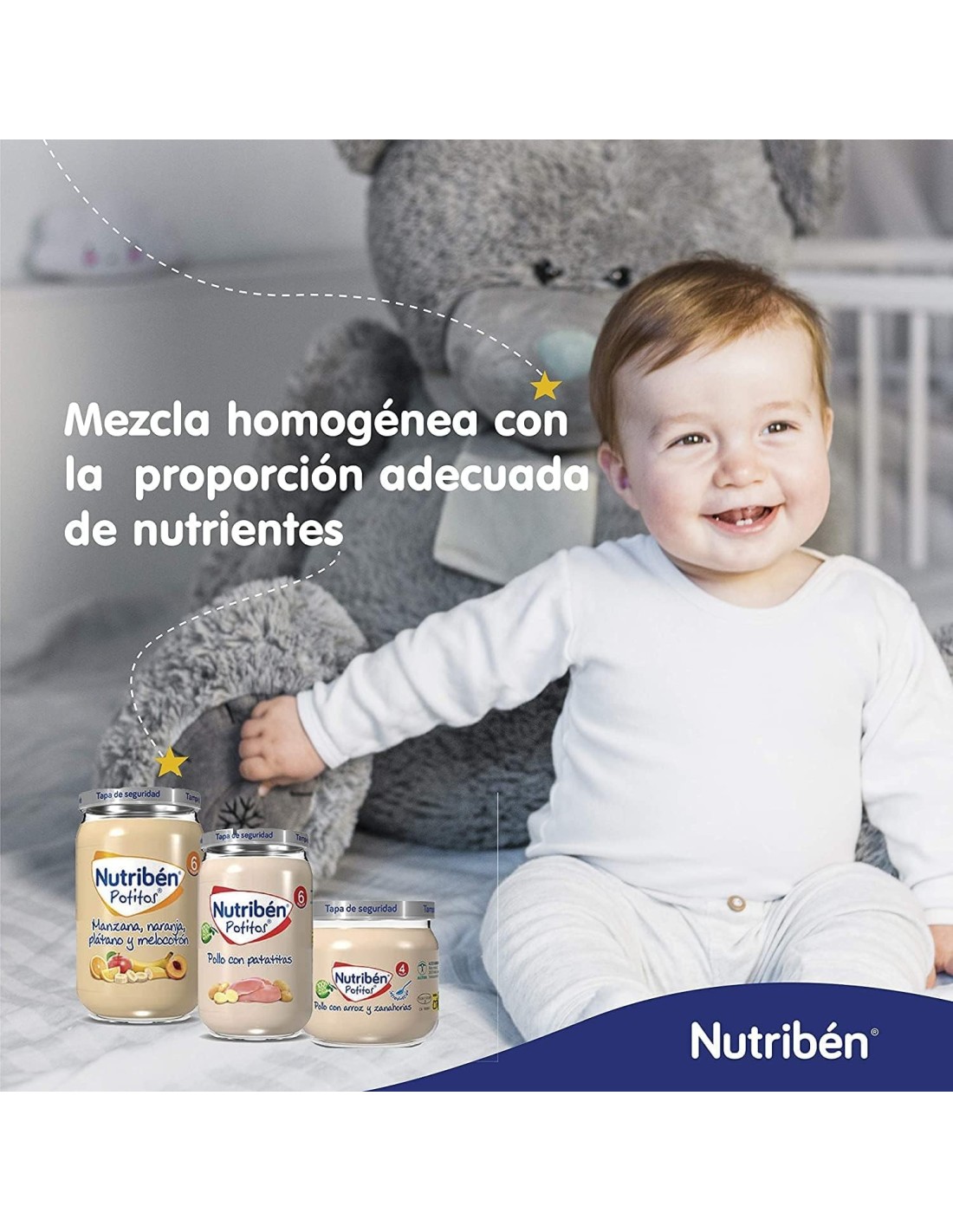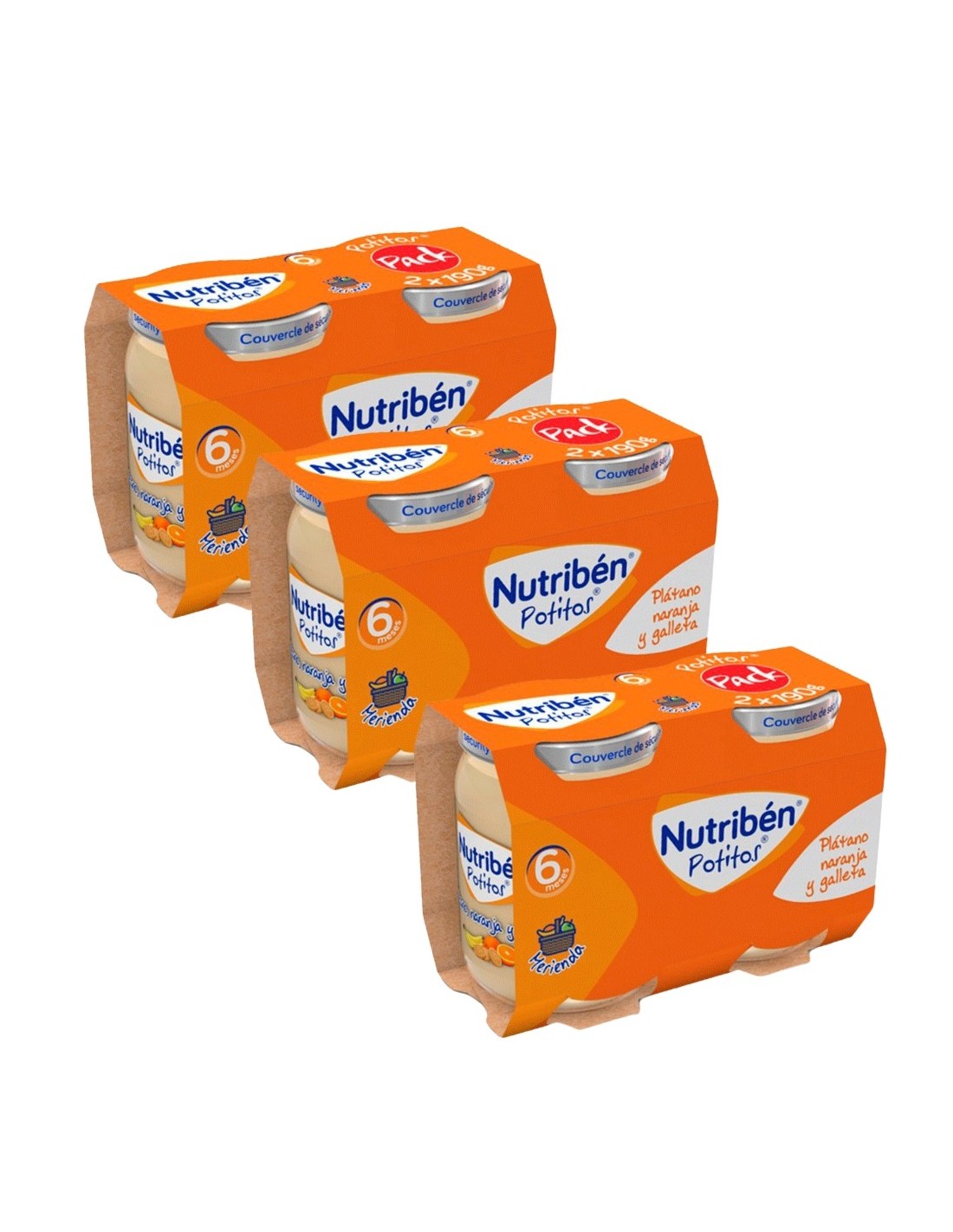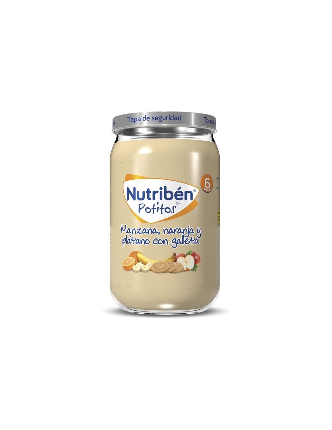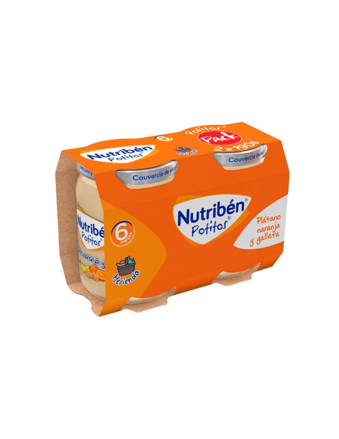 El Potito Plátano, Naranja y Galleta +6M Nutribén está elaborado con frutas de primera calidad y galleta sin gluten, aportando energía y nutrientes esenciales para bebés a partir de los 6 meses.