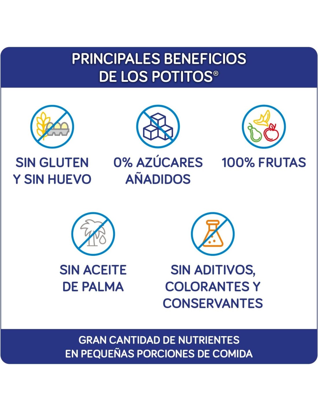 Plátano (45%), naranja (20%), agua de cocción, galleta sin gluten (9%) (harina de arroz, harina de maíz, aceite vegetal, azúcar de caña, minerales), y vitamina C (antioxidante).