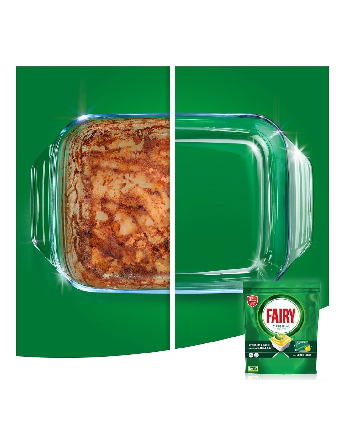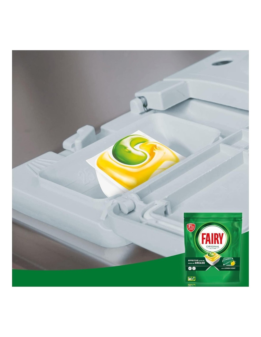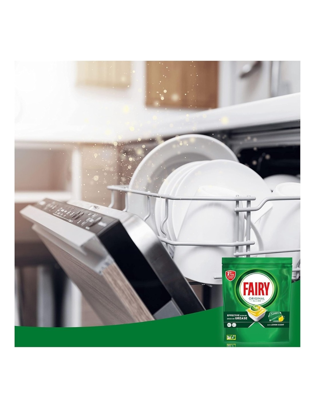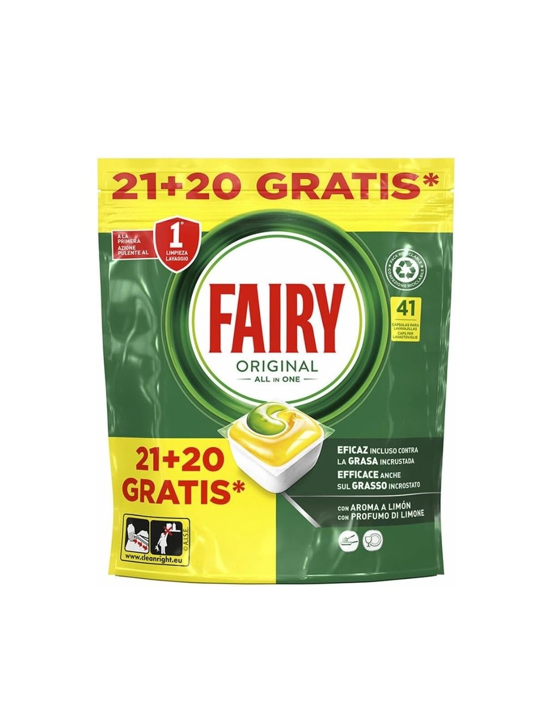 Fairy Original Todo en 1 combina una limpieza potente con funciones adicionales que cuidan tu vajilla. Gracias a su acción desengrasante, elimina incluso la grasa incrustada sin esfuerzo. Además, actúa como sal y abrillantador, favoreciendo un aclarado sin marcas y protegiendo el brillo de los cristales y la integridad de la plata. Cada cápsula se disuelve rápidamente, lo que mejora la eficacia del detergente desde el inicio del ciclo. Su fragancia fresca a limón deja una sensación de limpieza prolongada. Y su producción es más sostenible, ya que se fabrica con energía eléctrica 100% renovable.
