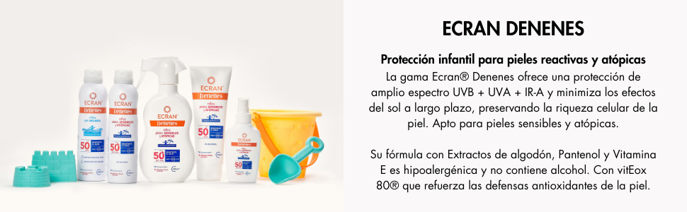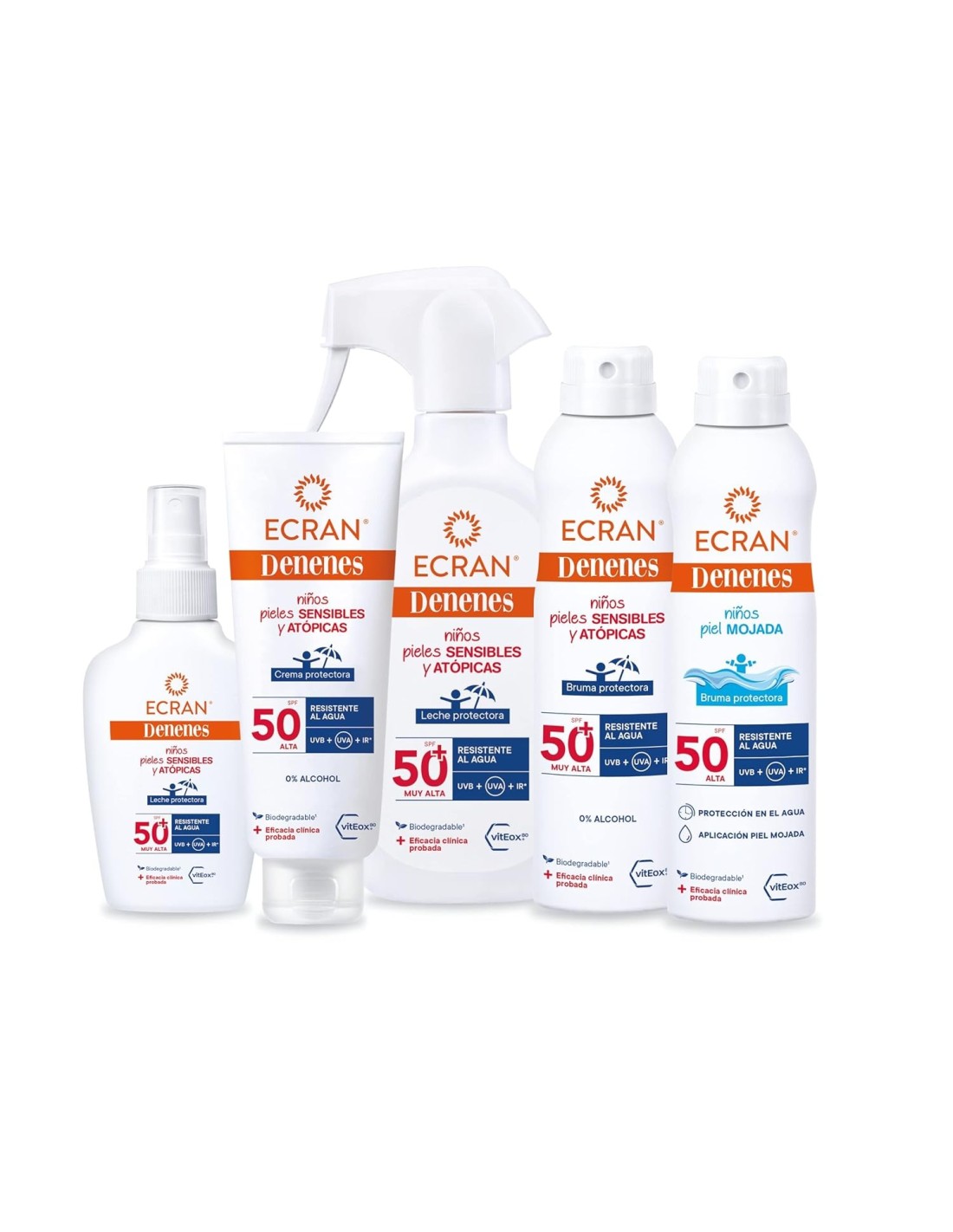 La leche protectora solar SPF50+ de Ecran Denenes ha sido especialmente formulada para proteger, cuidar y calmar las pieles más sensibles y atópicas frente a la radiación solar. Su fórmula hipoalergénica sin alcohol ofrece una protección de amplio espectro frente a los rayos UVA y UVB , al tiempo que refuerza las defensas naturales de la piel y la mantiene nutrida, calmada e hidratada.