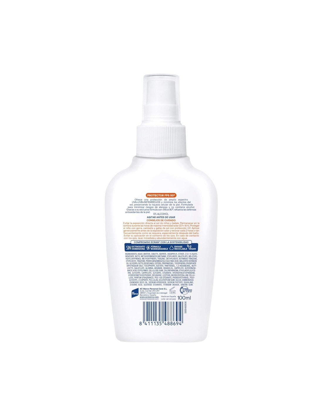 Se presenta en formato spray de 100 ml , cómodo y práctico para llevar siempre en el bolso o mochila. Su textura ligera y de rápida absorción no deja residuos pegajosos ni manchas blancas, y puede aplicarse fácilmente sobre la piel del rostro y el cuerpo del niño.