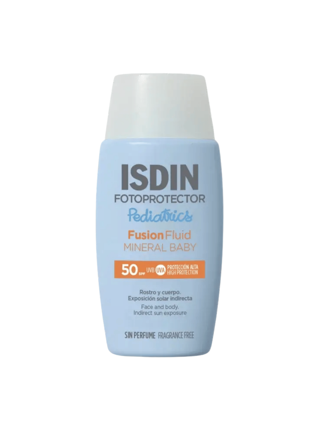 Fusion Fluid Mineral Baby Pediatrics SPF 50 de ISDIN es un protector solar 100% mineral especialmente diseñado para la piel frágil y delicada de bebés y niños. Su fórmula con filtros exclusivamente minerales ofrece una alta protección frente a los rayos UVB y UVA, respetando al máximo las pieles más sensibles.