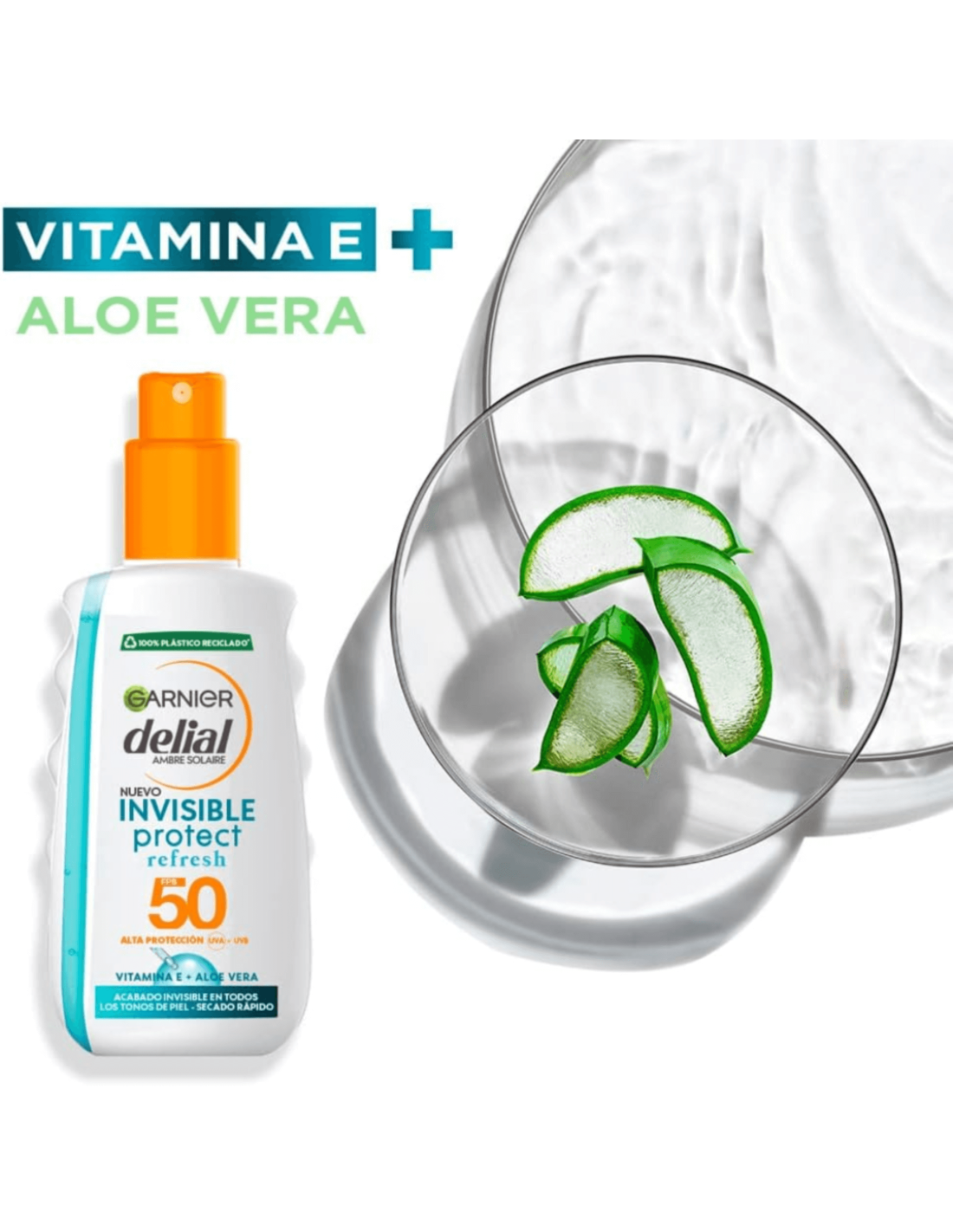 El Spray Solar Invisible Protect FPS 50 de Garnier Delial ha sido diseñado para proporcionar protección solar muy alta (SPF 50) frente a los rayos UVA y UVB, sin comprometer la estética ni la comodidad. Su formulación transparente lo hace ideal para todos los tonos de piel. No deja residuos blancos y ofrece un acabado invisible y seco.