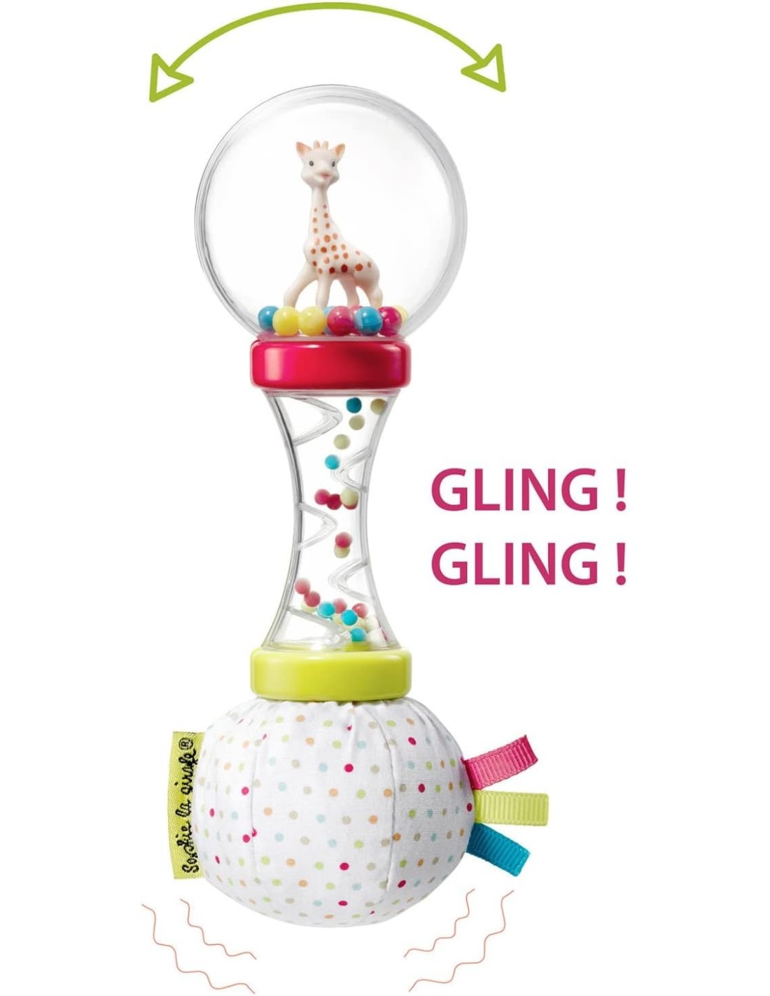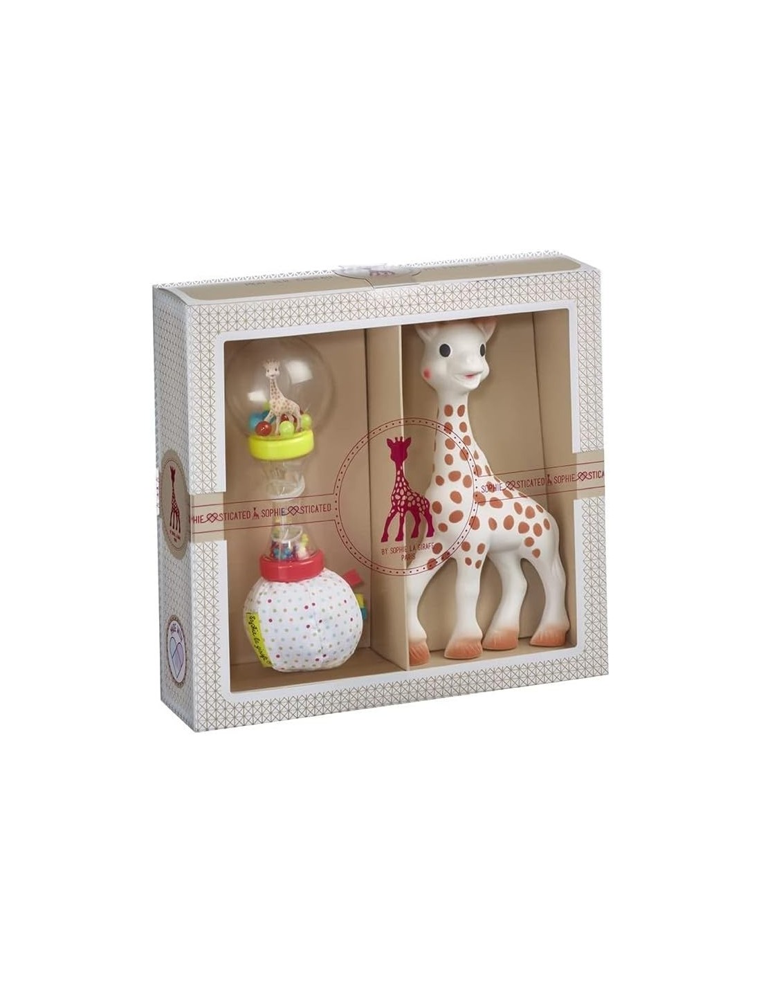 la famosa Sophie la Girafe, fabricada con caucho natural 100 %, y un sonajero maracas con bolas de colores que estimula la curiosidad auditiva y visual del pequeño.
