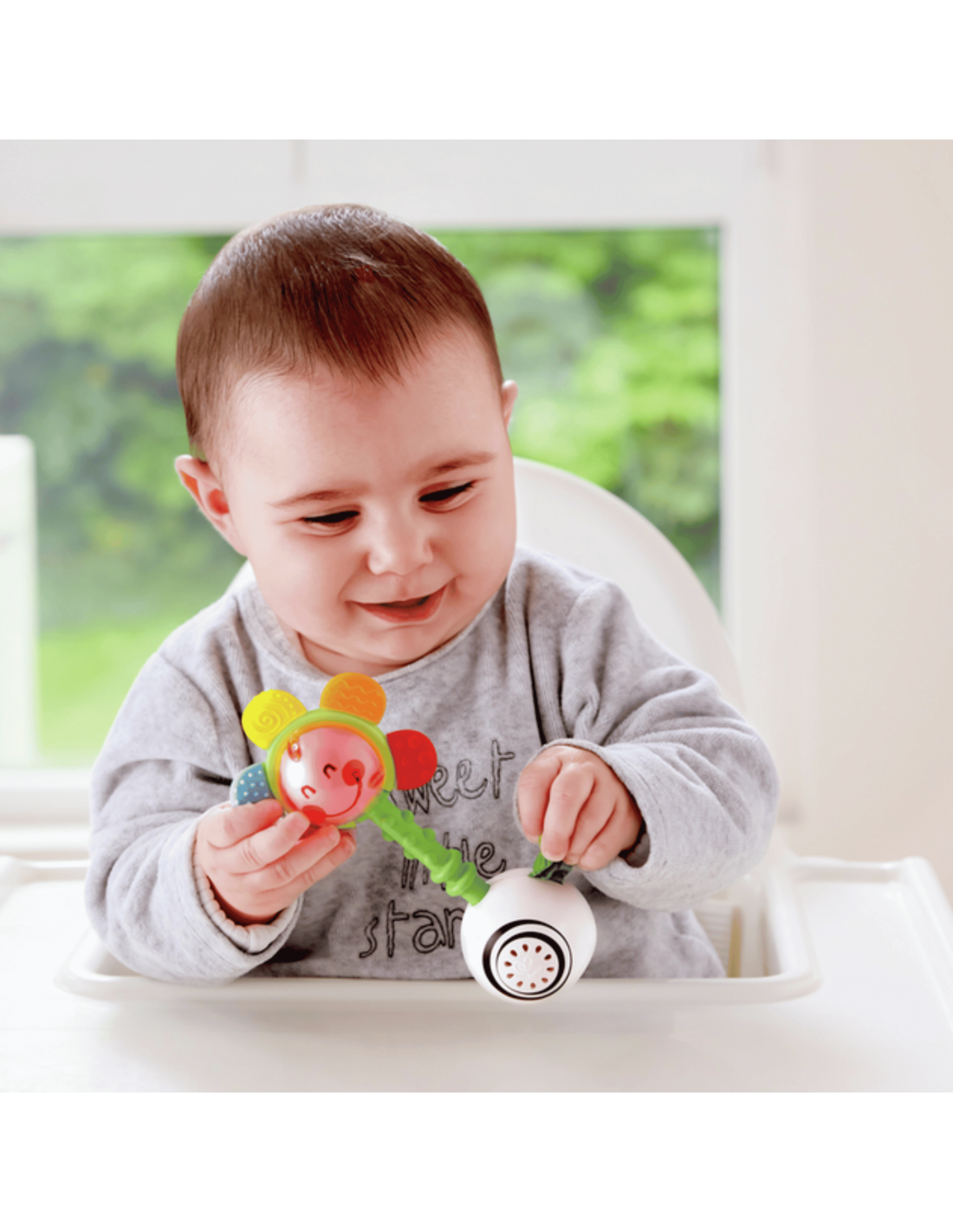 El Sonajero de Flor “Agita y Brilla” Hape es un adorable juguete sensorial diseñado para estimular la vista, el oído y el tacto del bebé desde los primeros días de vida. Su estructura con forma de flor incluye luces suaves y sonidos armoniosos que se activan al agitarlo, creando un efecto visual y auditivo que cautiva al bebé y favorece su desarrollo sensorial temprano.