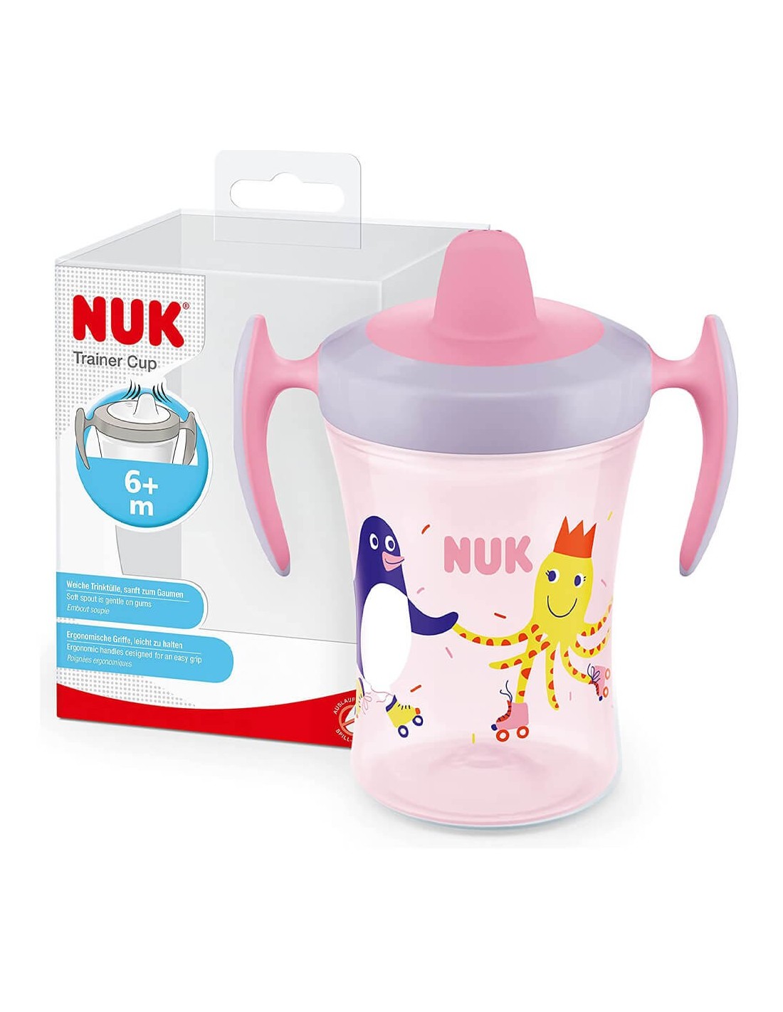 La Taza de entrenamiento NUK (color rosa, 230 ml) ayuda al bebé a pasar del biberón al vaso desde los 6 meses. Incorpora boquilla suave de silicona con sistema antigoteo y válvula anticólicos para un flujo uniforme y cómodo. Sus asas ergonómicas con relieve antideslizante favorecen el agarre de manos pequeñas y la autonomía en cada sorbo.