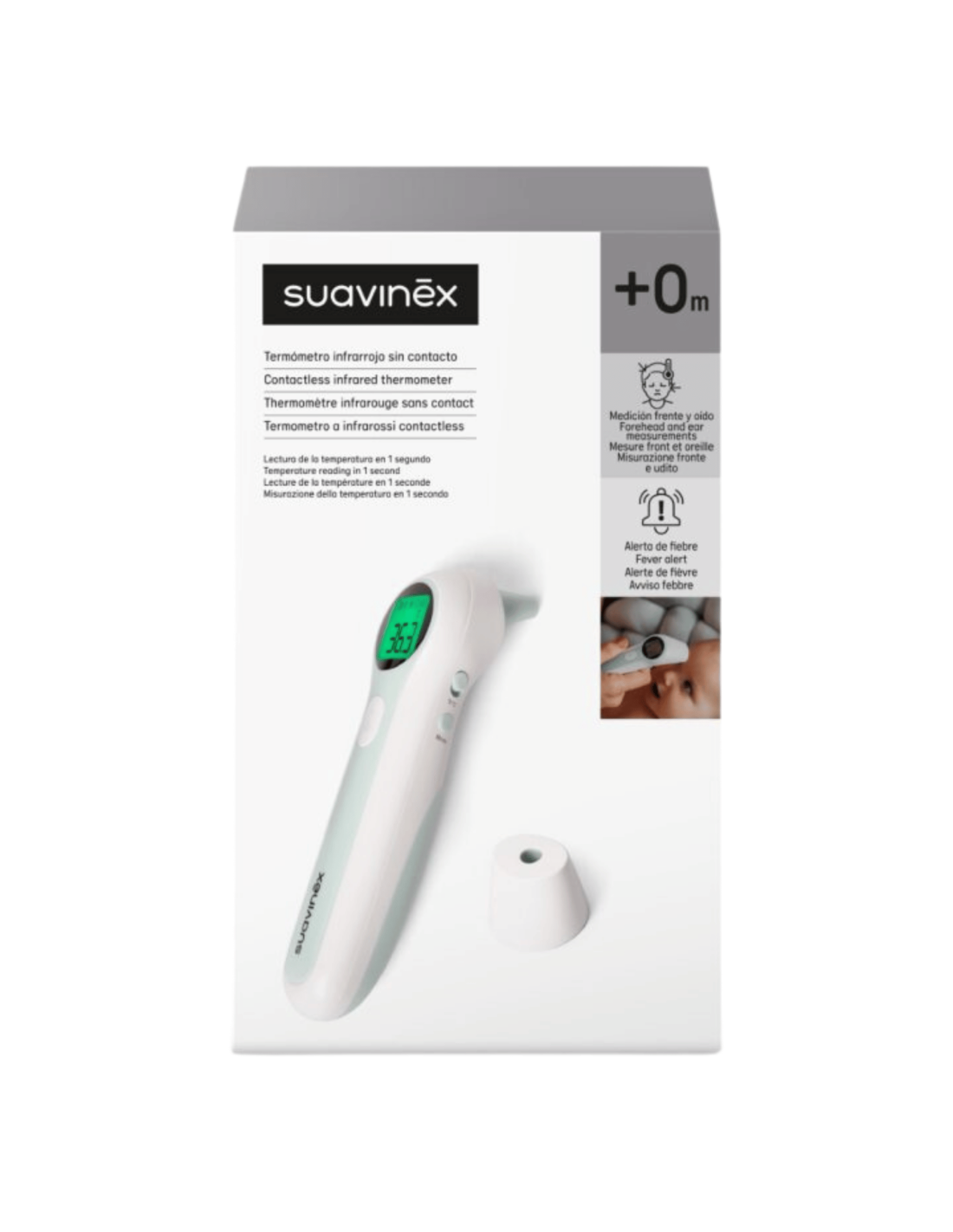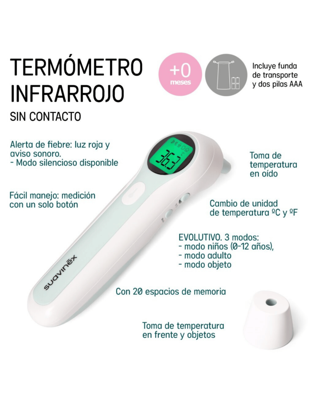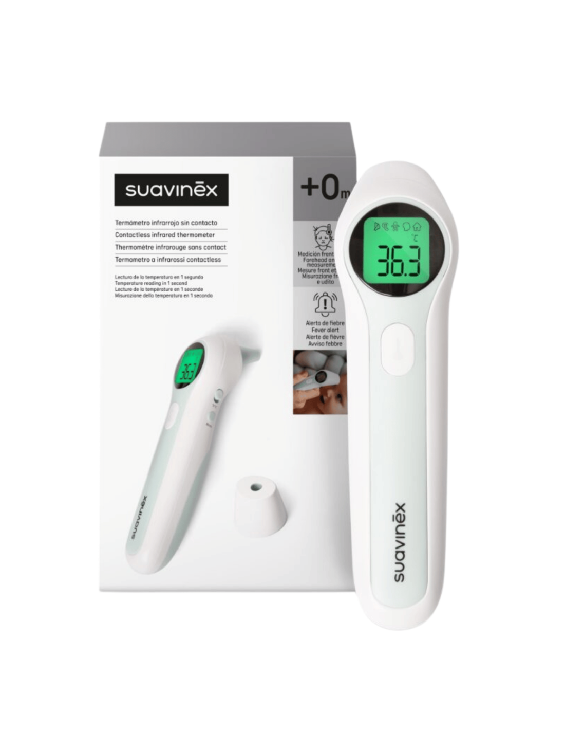El Termómetro Infrarrojos con Bolsa de Transporte y Pilas de Suavinex permite medir la temperatura corporal de forma rápida, higiénica y sin contacto, lo que lo convierte en una opción ideal para bebés y niños pequeños. Gracias a su tecnología de infrarrojos, realiza la medición en pocos segundos simplemente acercándolo a la frente, evitando molestias y facilitando el control de la fiebre incluso mientras el bebé duerme.