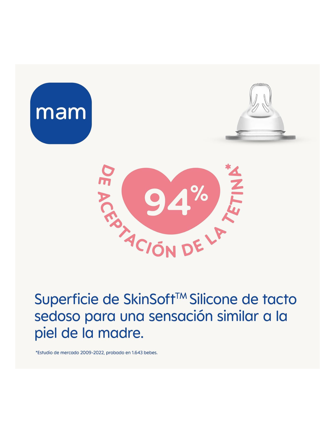 La Tetina MAM Baby Flujo Lento 0M+ está especialmente diseñada para los recién nacidos, ofreciendo un flujo constante y suave que favorece una alimentación relajada y natural. Su exclusiva superficie SkinSoft™ de silicona ultra suave imita la sensación del pecho materno y es aceptada por el 94 % de los bebés*, facilitando la combinación entre lactancia y biberón.