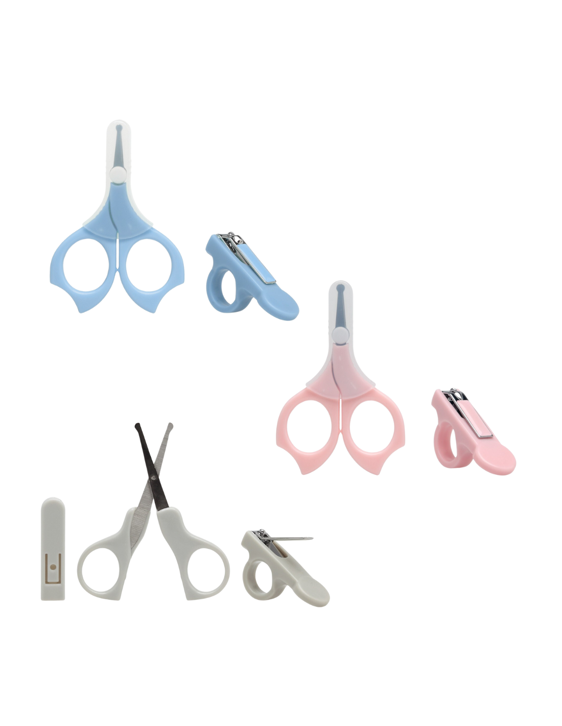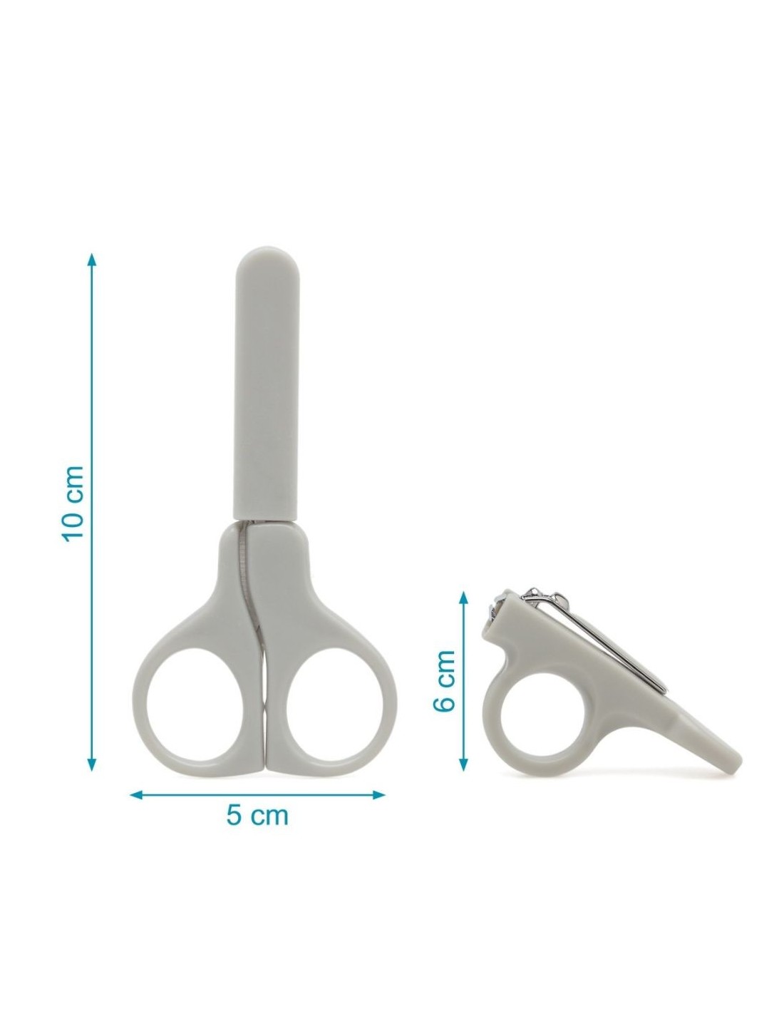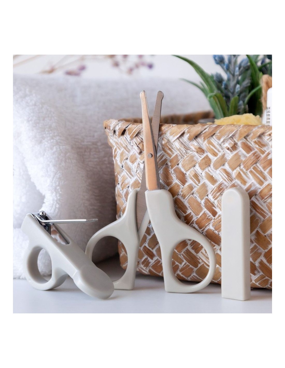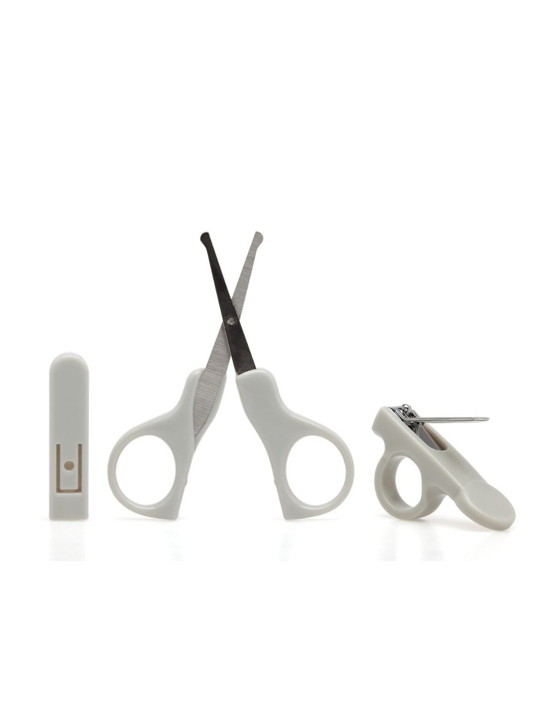 Unas tijeras de punta redondeada, un cortaúñas ergonómico y limas suaves para retoques.