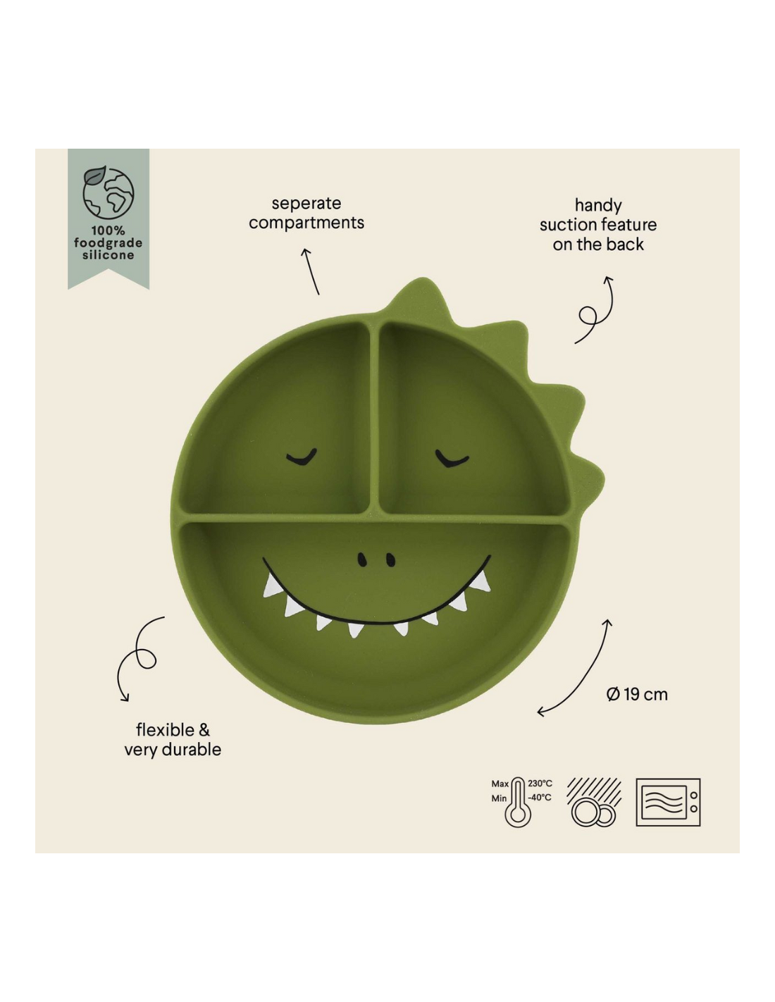 Su simpático diseño de dinosaurio y su estructura compartimentada permiten separar diferentes tipos de alimentos, ayudando al niño a identificar texturas y sabores.